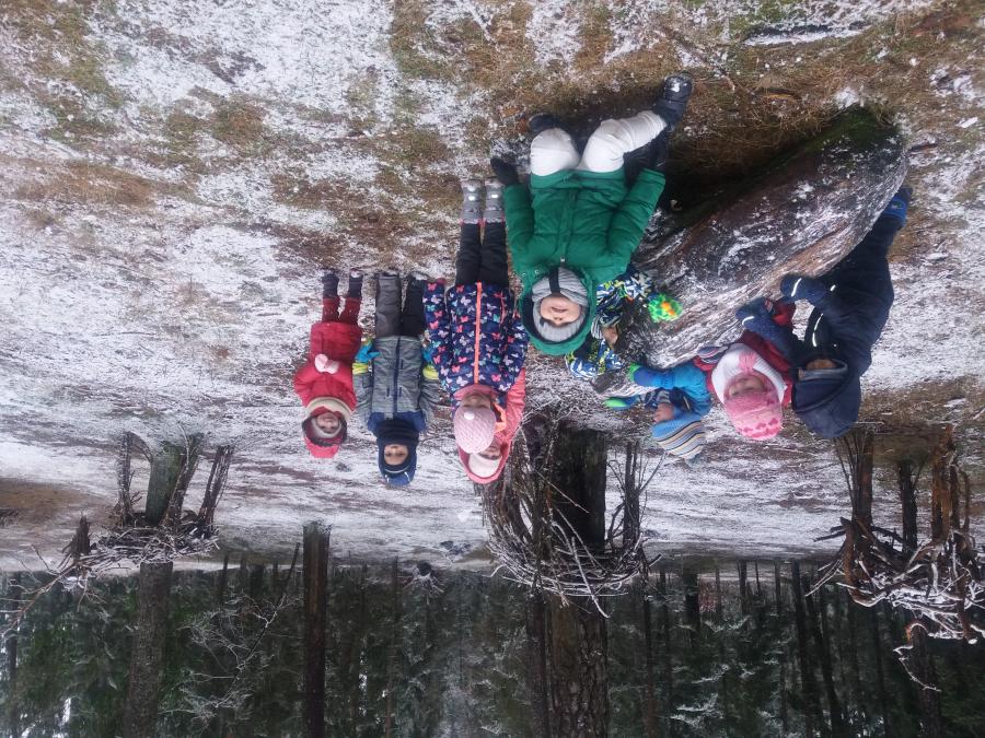 Krasnoludki podziwiały spadający śnieg podczas spaceru do lasu. Na leśnym placu zabaw miały okazję zobaczyć leśne stworki mieszkające na placu zabaw... radosci nie było końca:)