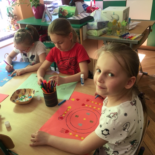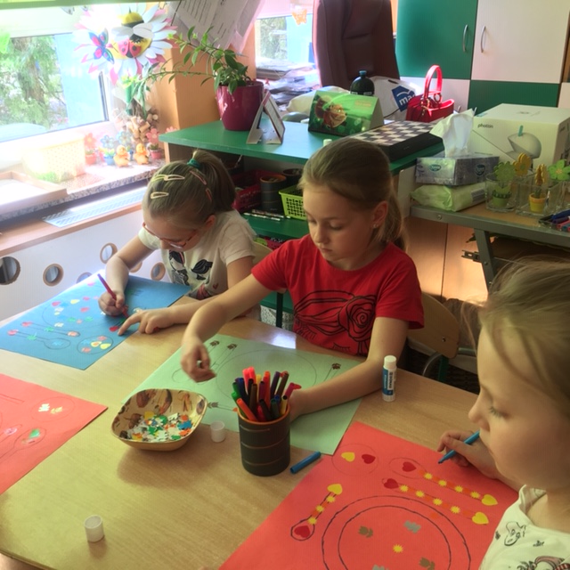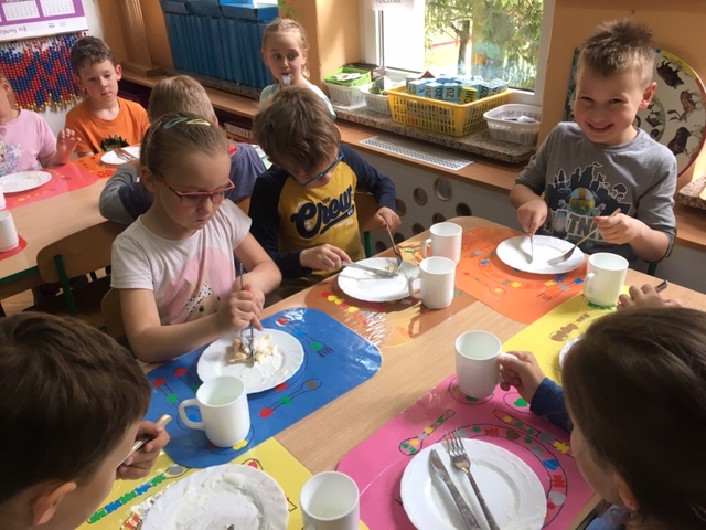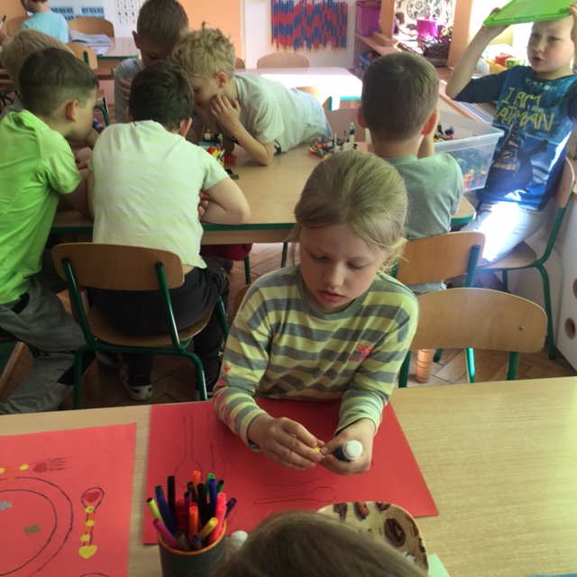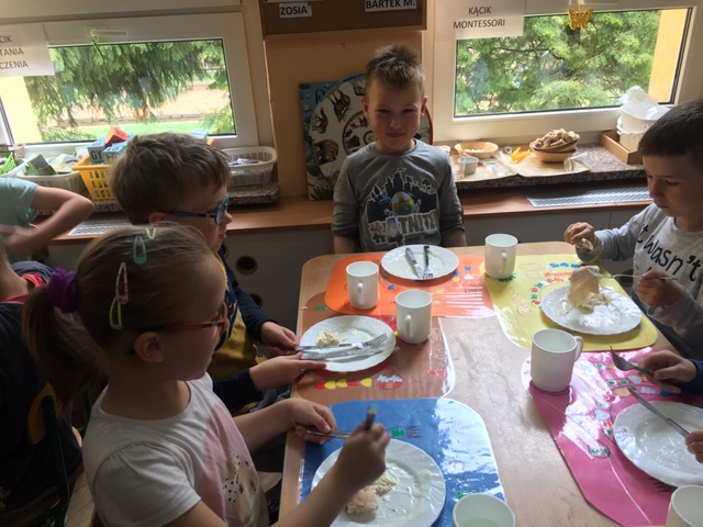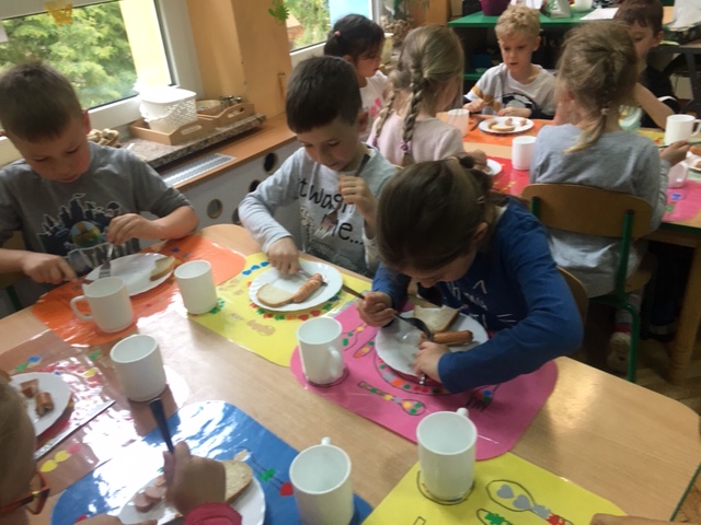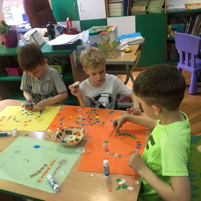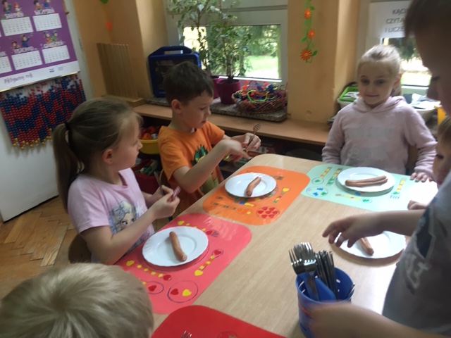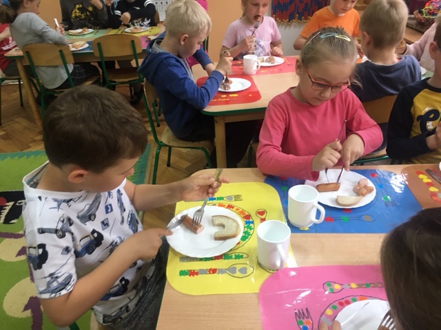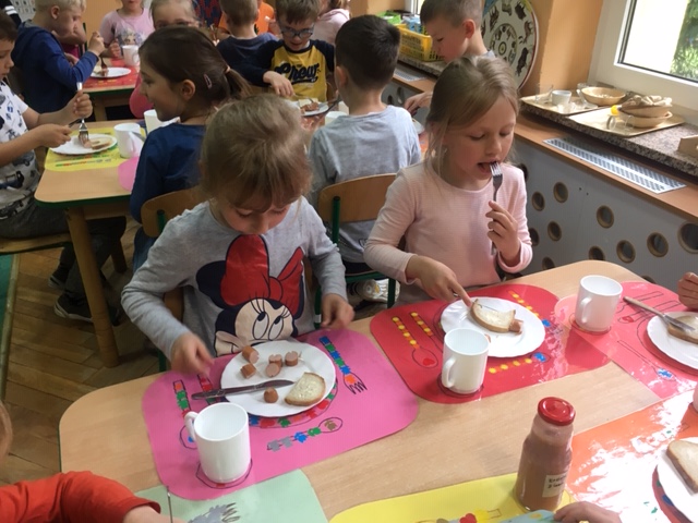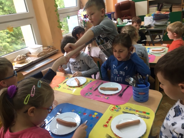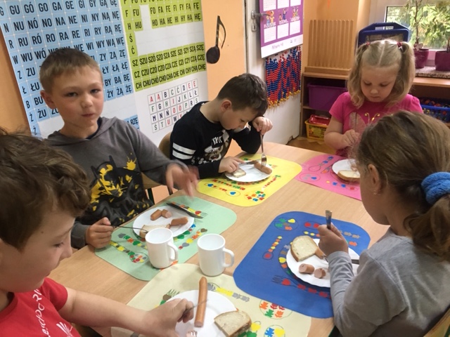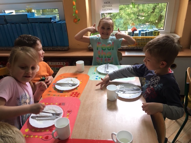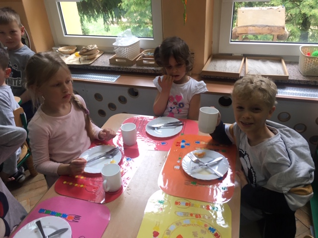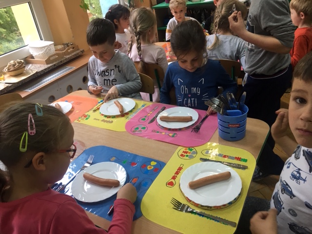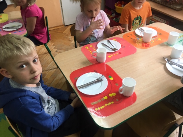 Pszczółki jako starszaki uczą się również ogłady i dobrych manier. Zasady kultury przy stole nie są im obce. Najpierw samodzielnie przygotowały kolorowe podkładki, aby nauczyć się układać prawidłowo sztućce. Teraz uczą sie posługiwania się nimi. Są już takie dorosłe...