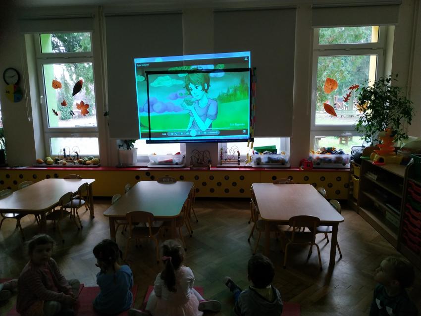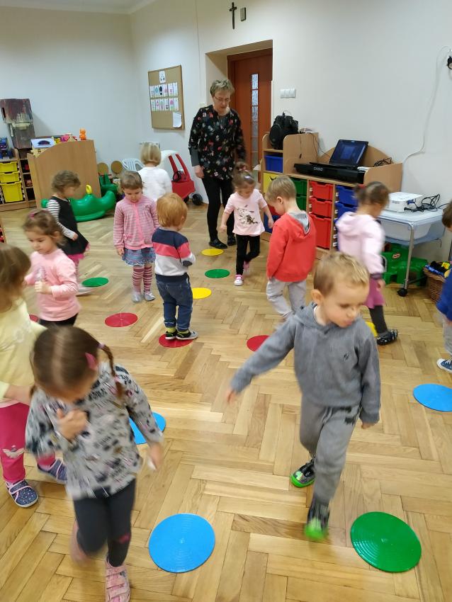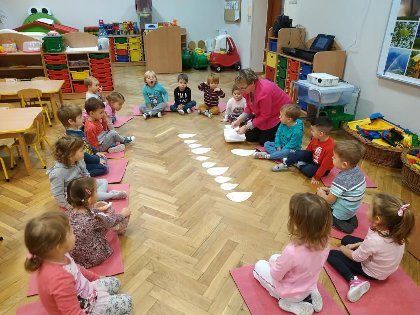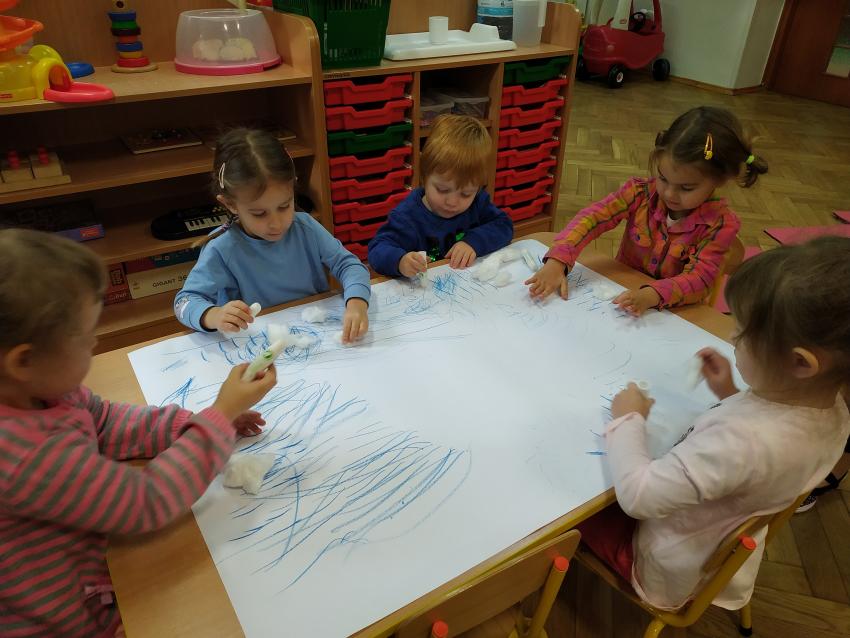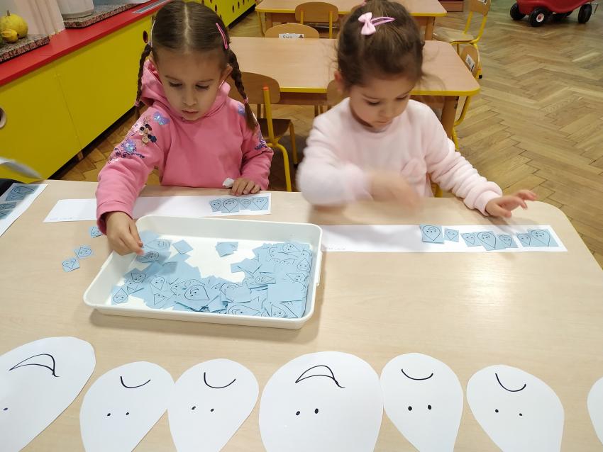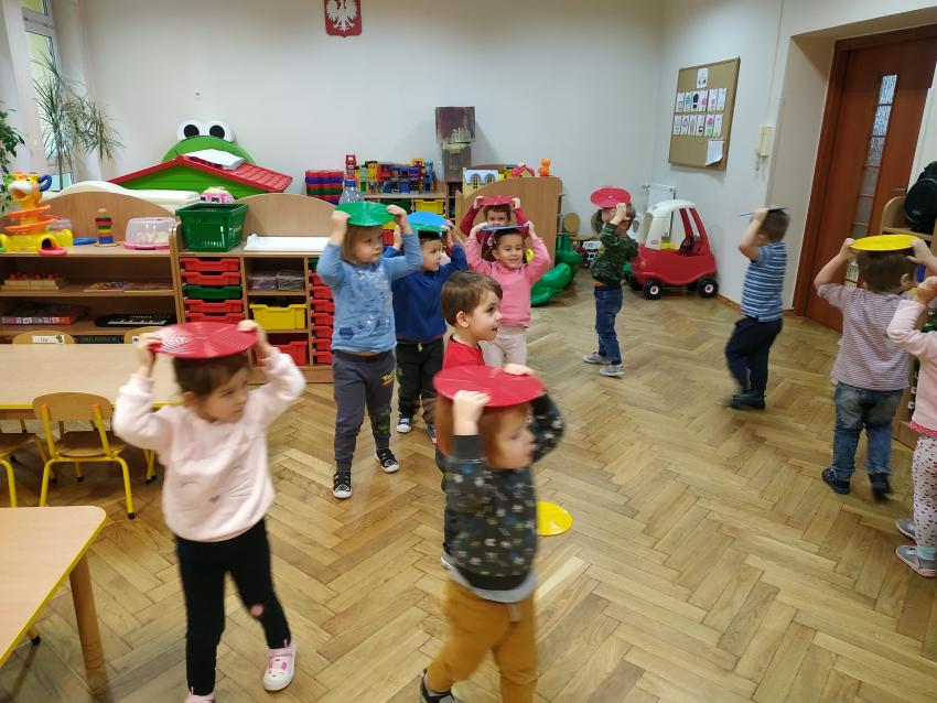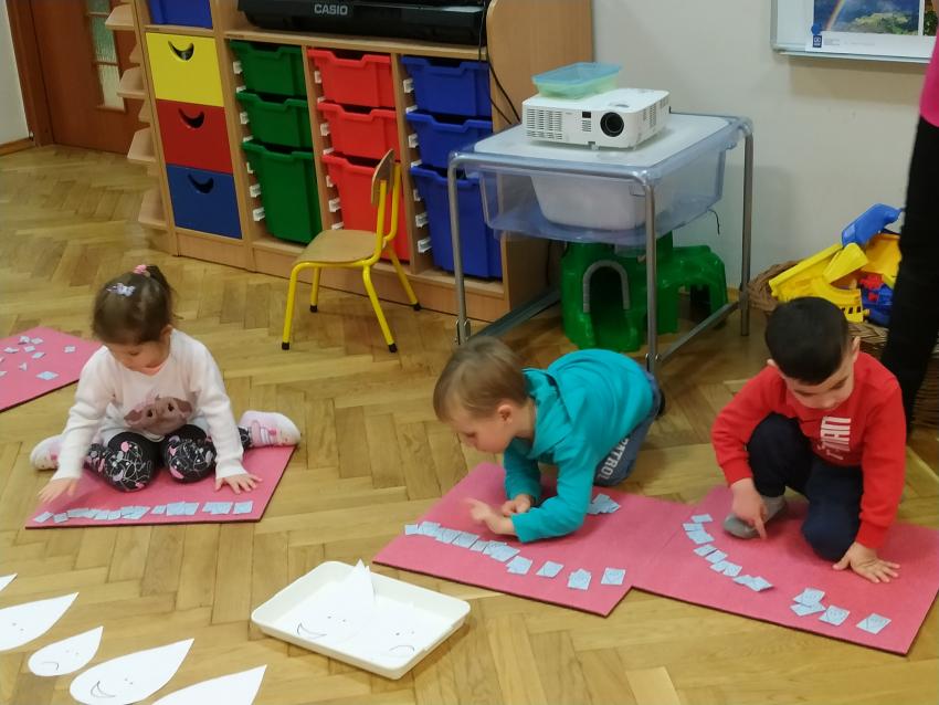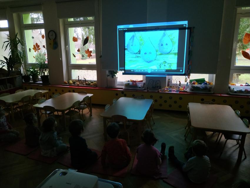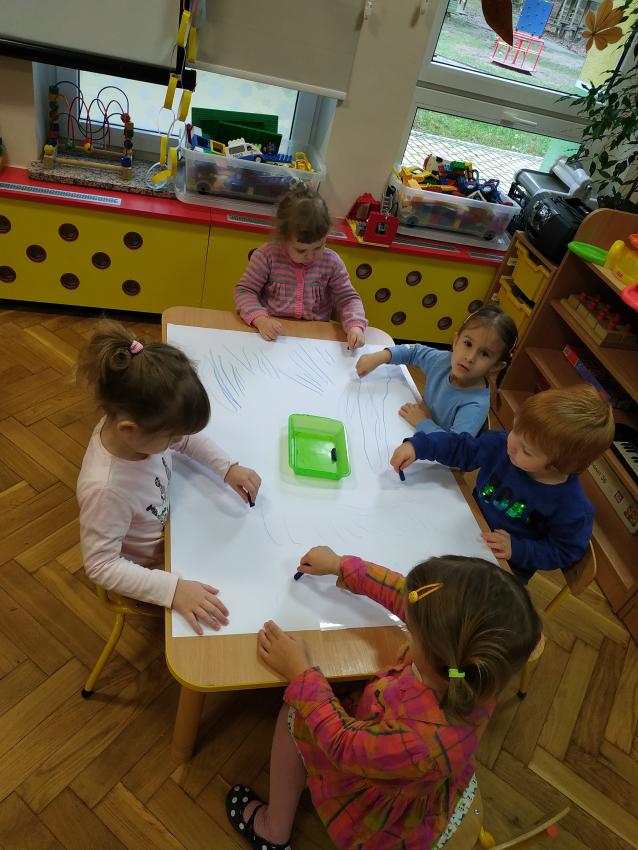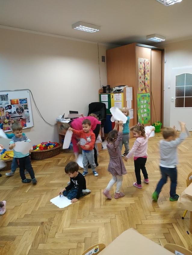 Chociaż jesienna pogoda kojarzy się ze smutkiem, zajęcia w grupie „Zajączków” sprawiły dzieciom wiele radości. W minionym tygodniu rozmawialiśmy o jesiennej pogodzie – wietrze, chmurach i deszczu. Poznaliśmy Dyzia, który marzył, patrząc na chmurki i za jego przykładem przyglądaliśmy się chmurom – ich kształtom i kolorom, rysowaliśmy deszcz w rytm muzyki i za pomocą słuchu rozpoznawaliśmy wiatr, burzę i rodzaj deszczu (mały, duży, ulewa). Staraliśmy się też samodzielnie stworzyć deszczową muzykę. Poznaliśmy piosenkę Zła pogoda, przy której bawiliśmy się kolorowymi krążkami, zamieniając je w kałuże, parasolki, kierownice i bębenki. Deszczowe kropelki uczyły nas dostrzegać i kontynuować regularności i rytmy oraz grupować elementy według wielkości.