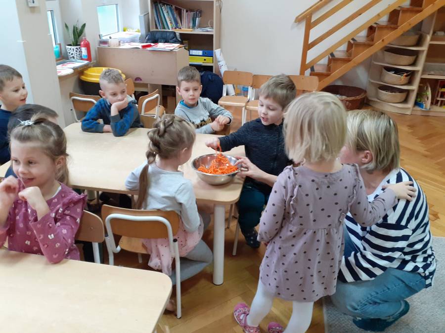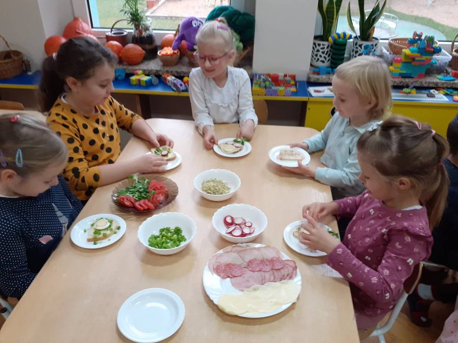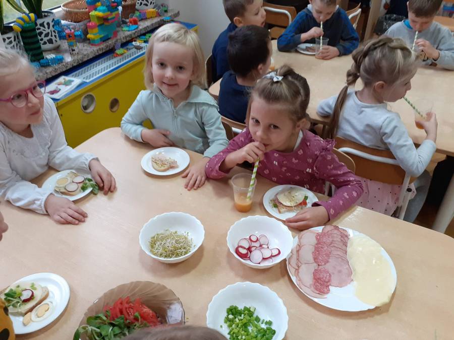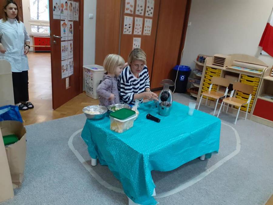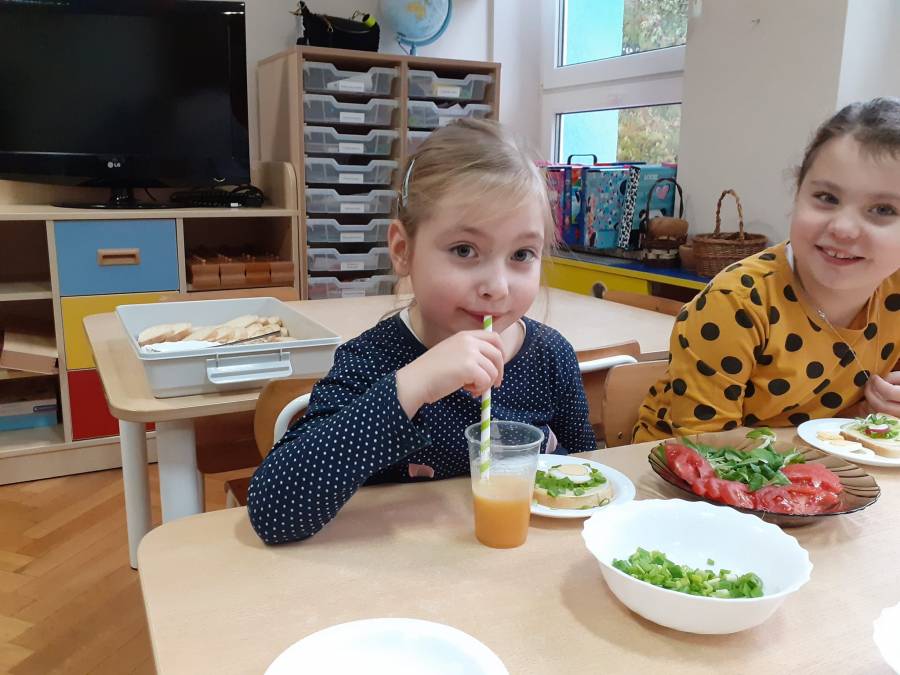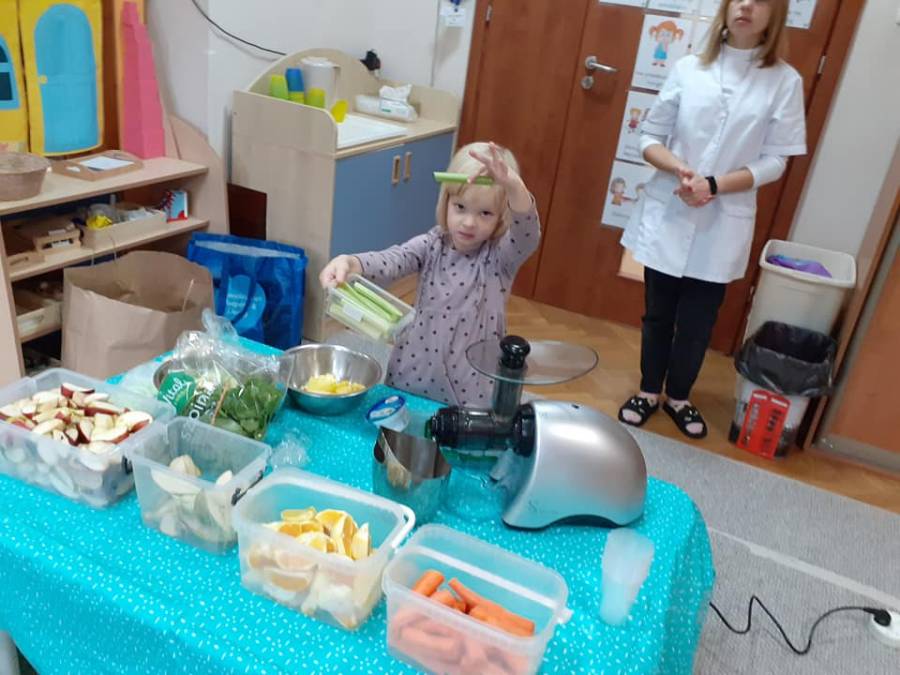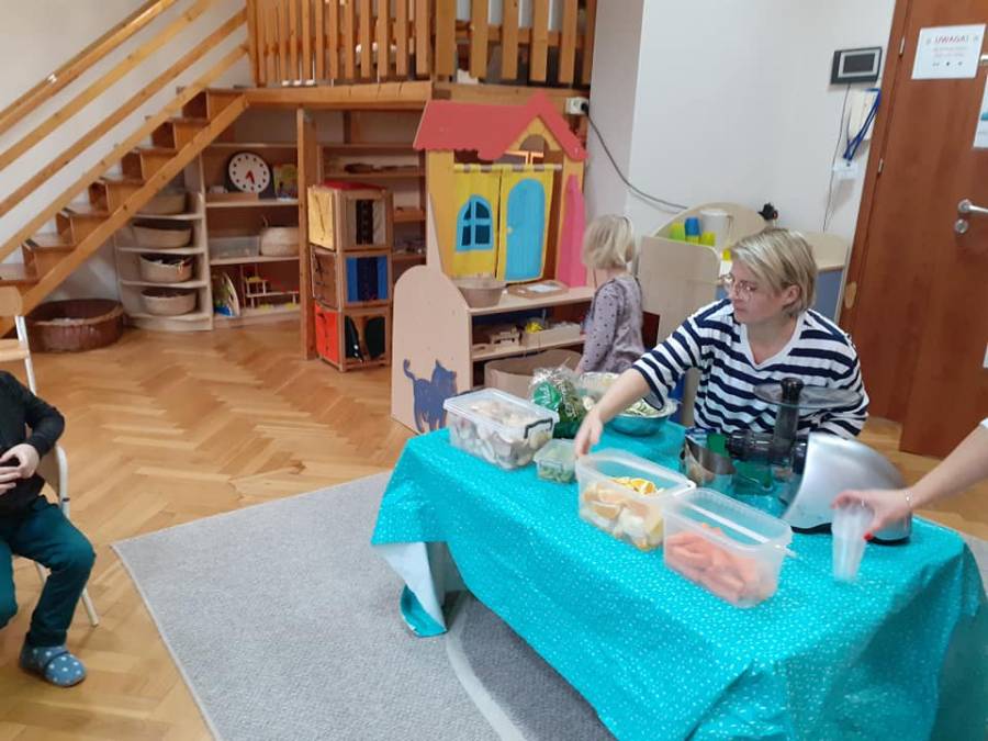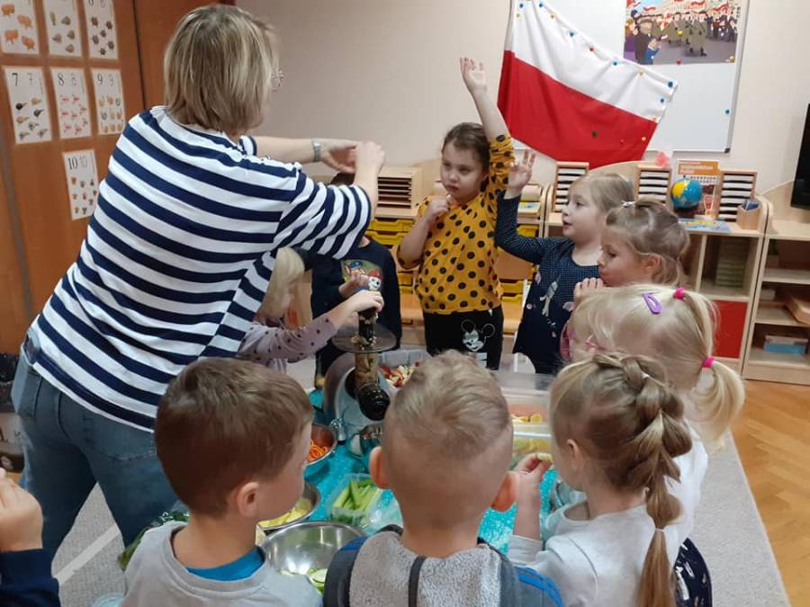 Grupa "TROPICIELE"( MONTESSORI) już od samego śniadania bardzo zdrowo rozpoczęła dzisiejszy poranek. Obchodziliśmy dzisiaj "Dzień zdrowego jedzenia i gotowania". Z tej okazji zaprosiliśmy do nas mamę naszej Zuzi p. Annę Arciszewską (właścicielkę naszej supraskiej restauracji "Prowincja"), która wspólnie z dziećmi przygotowała przepyszne i zdrowe soczki owocowe. Dzieci bardzo chętnie pomagały w wyciskaniu soków oraz próbowały jak smakuje "zakręcona" marchewka w połączeniu z sosem z serka kokosowego. Nie zabrakło też kiełków brokuła na kanapce, szczypiorku i rzodkiewek.