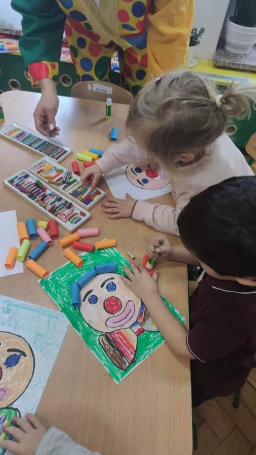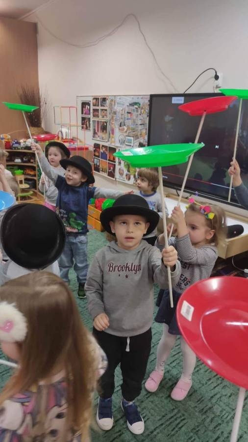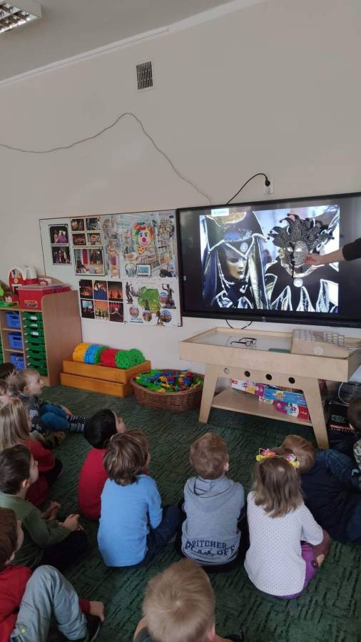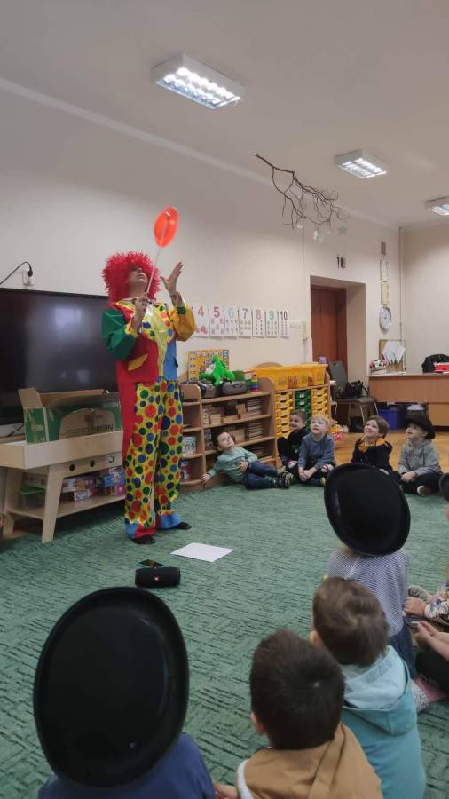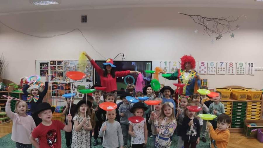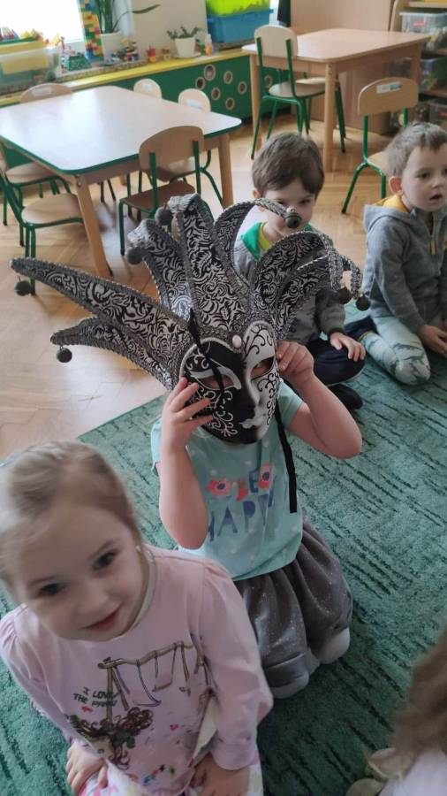 Karnawałowe,kolorowe klauny,maski weneckie były bohaterami zabaw karnawałowych.