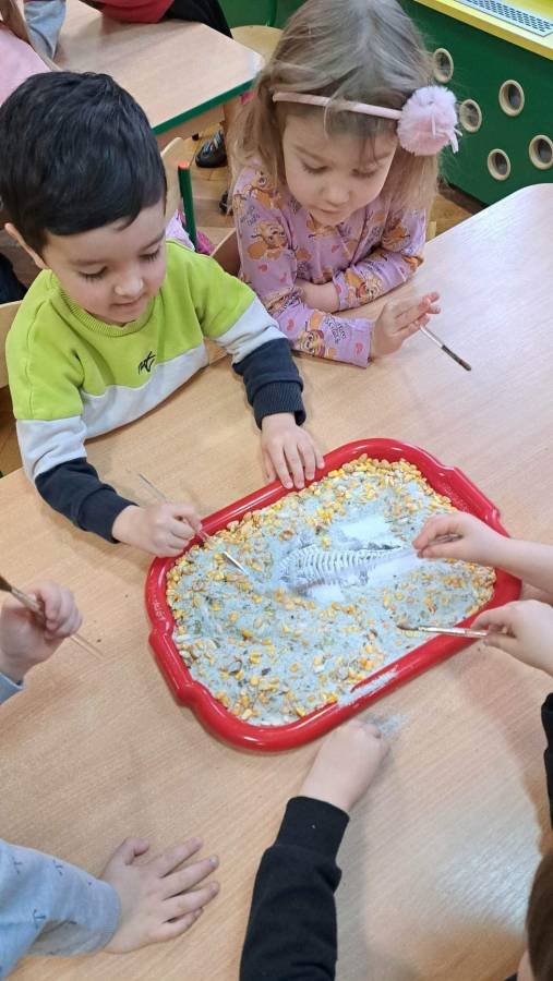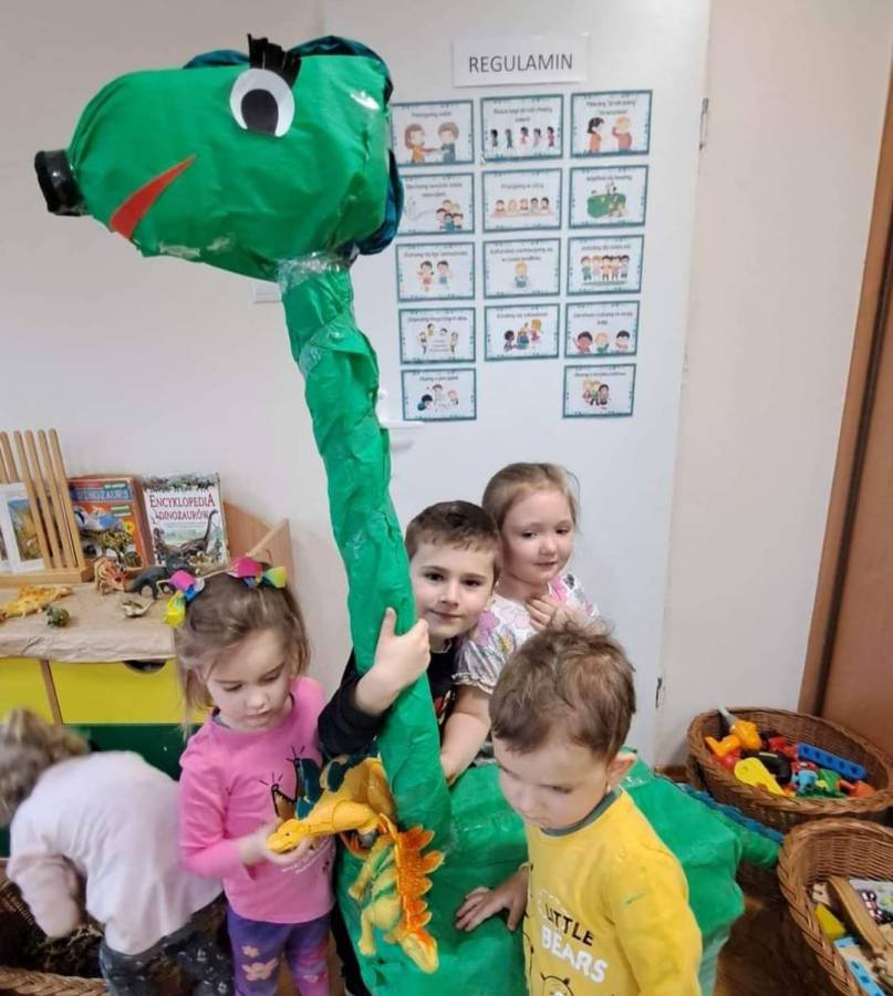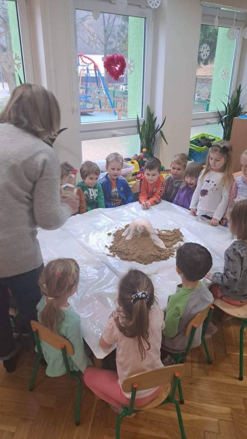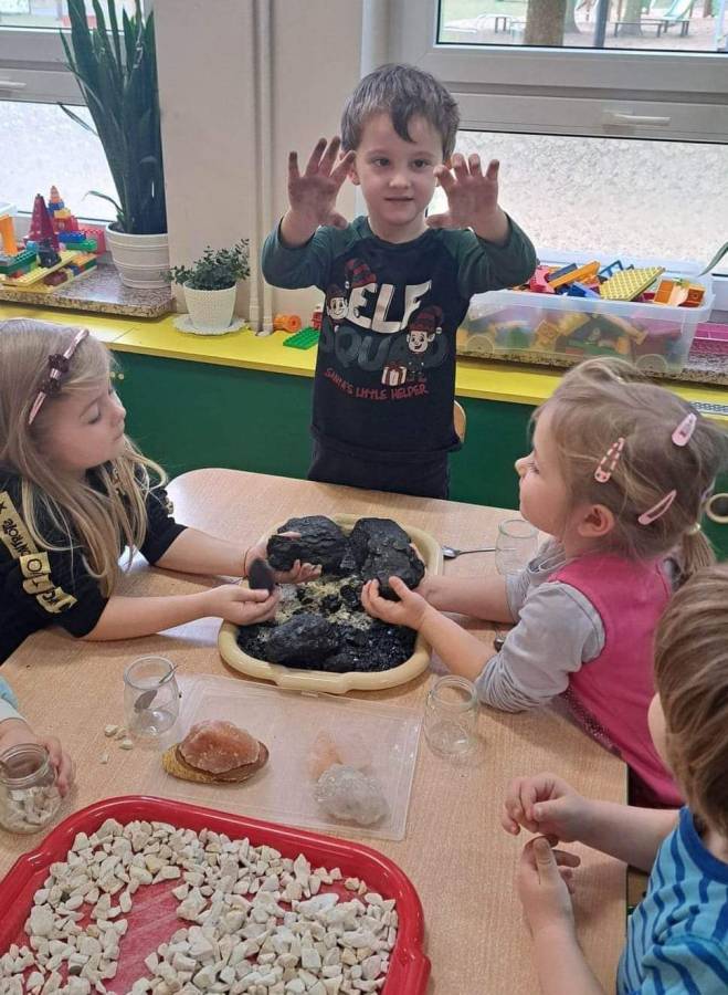 Odbyliśmy również podróż do prehistorycznych czasów- rozmawialiśmy o dinozaurach, jaskiniowcach, wulkanach oraz o soli i węglu.