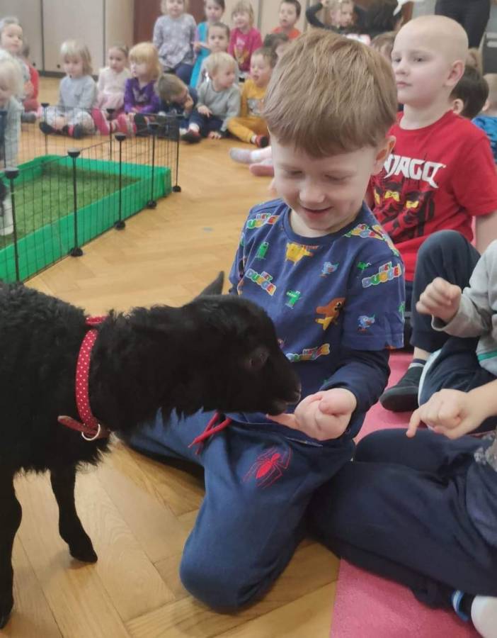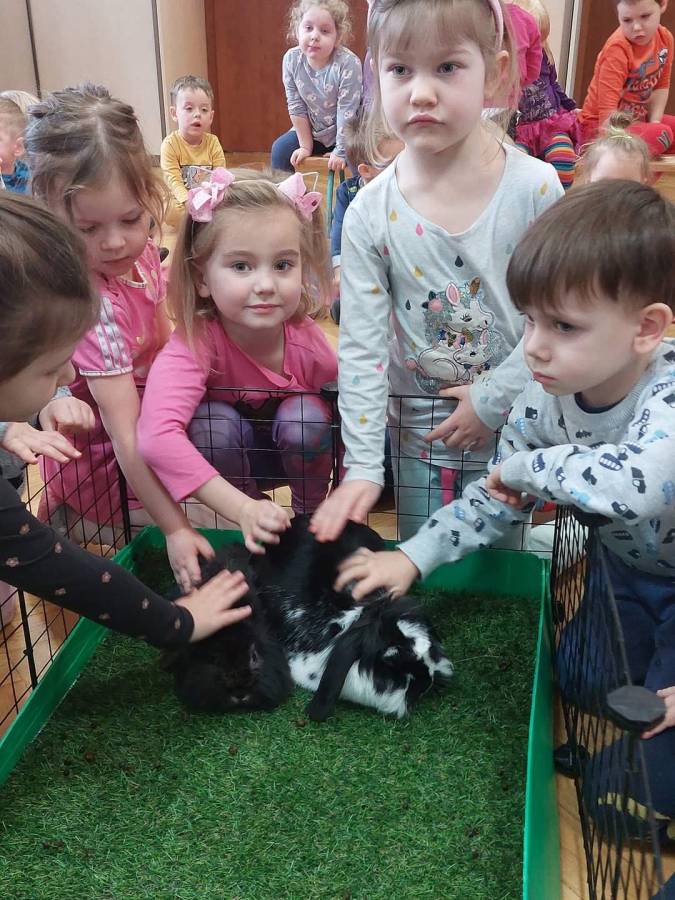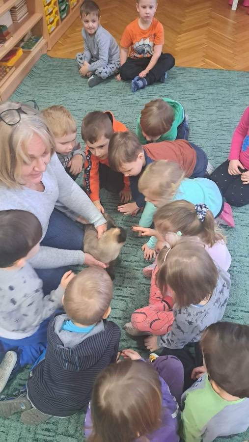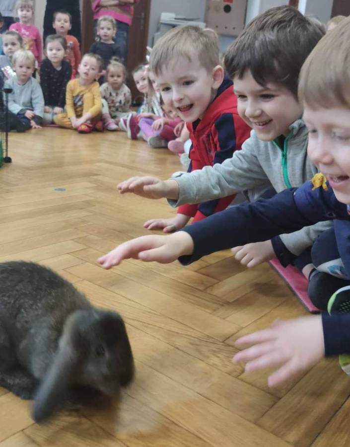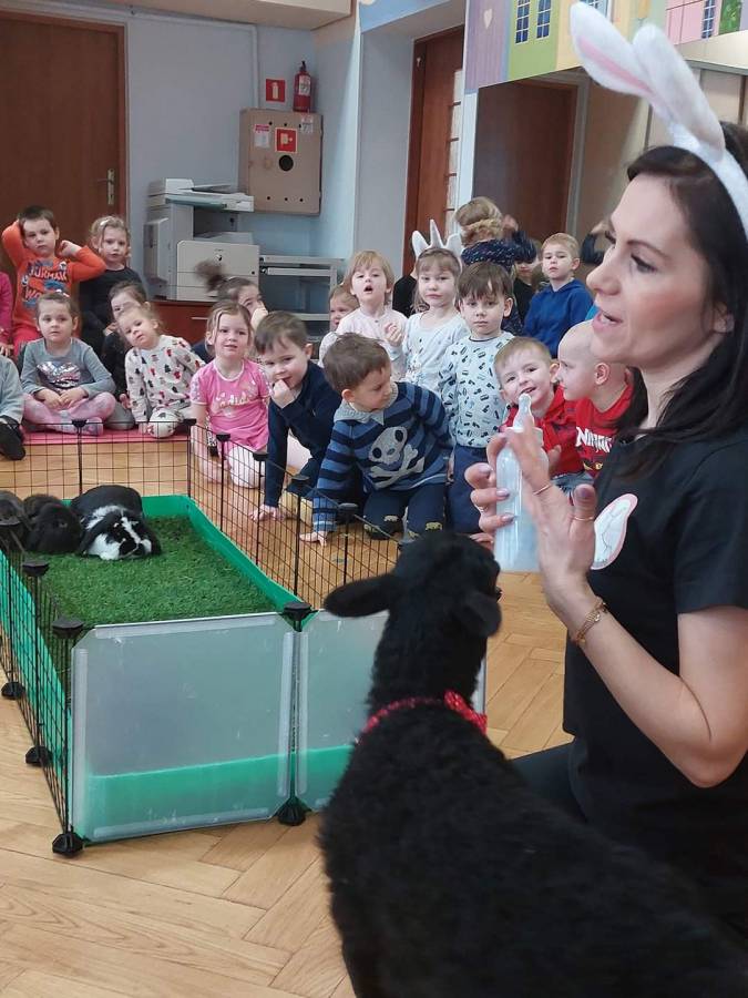Uczestniczyliśmy w warsztatach edukacyjnych z udziałem żywych zwierząt,,Puchata Radość ".Mogliśmy delikatnie się nimi zajmować.