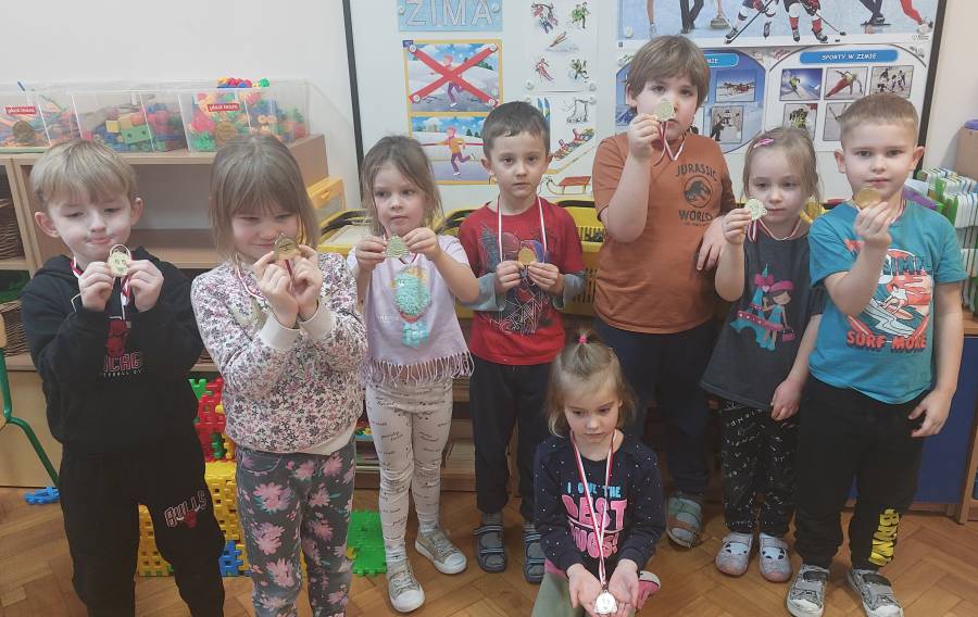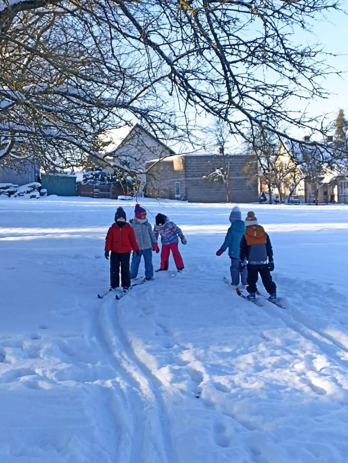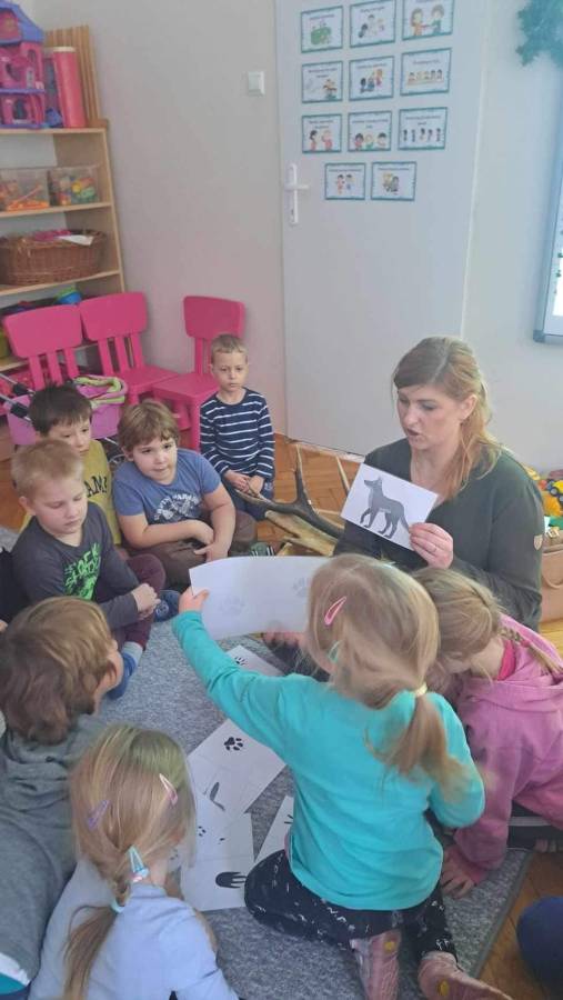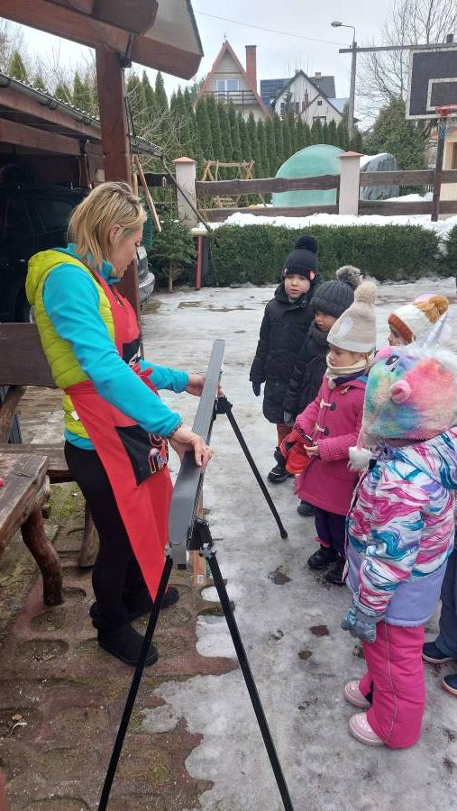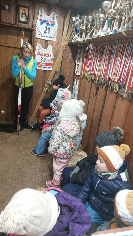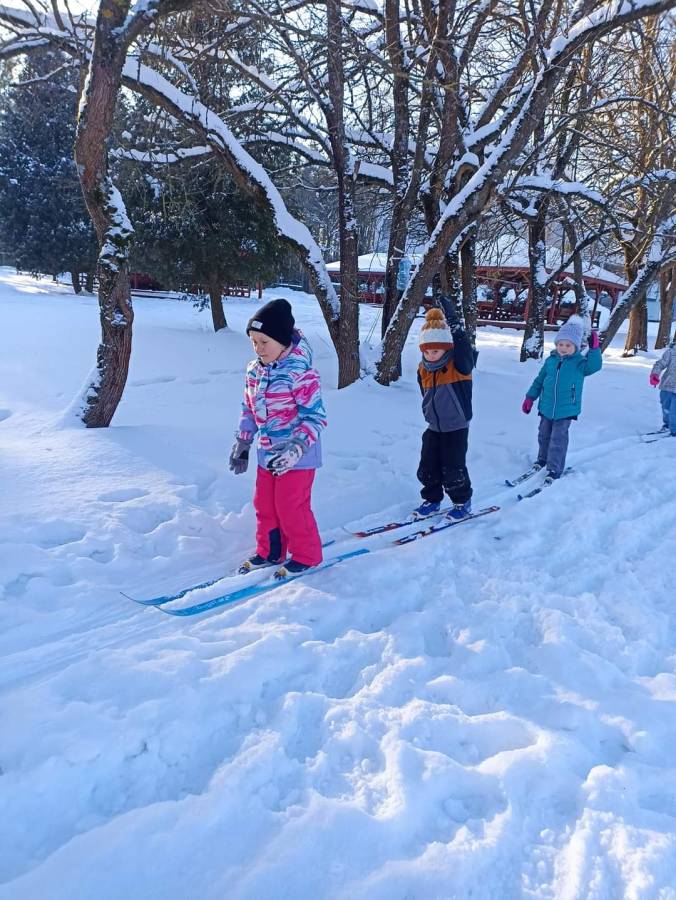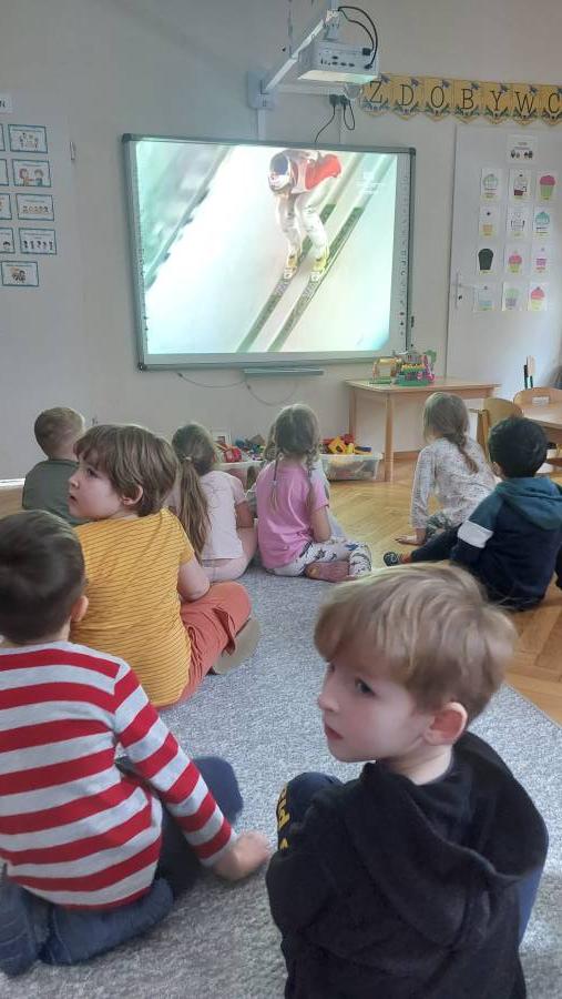 Odwiedziła nas też mamusia Zosi w ramach zajęć outdoorowych. Dzieci poszerzyły wiedzę na temat - zwierząt i ptaków. Jak przetrwać zimę. Dzieci poznały też tropy zwierząt. Rozmawialiśmy również o zimowych mistrzostwach sportowych. Dzieci zapoznały się z dyscyplinami sportowymi oraz z symbolem olimpiady (pięć kół). Korzystały codziennie z pięknej zimowej aury. Byliśmy również w Domu Ludowym na filmie Psi Patrol. Wybraliśmy się także na wycieczkę do Narciarni u Magdy.