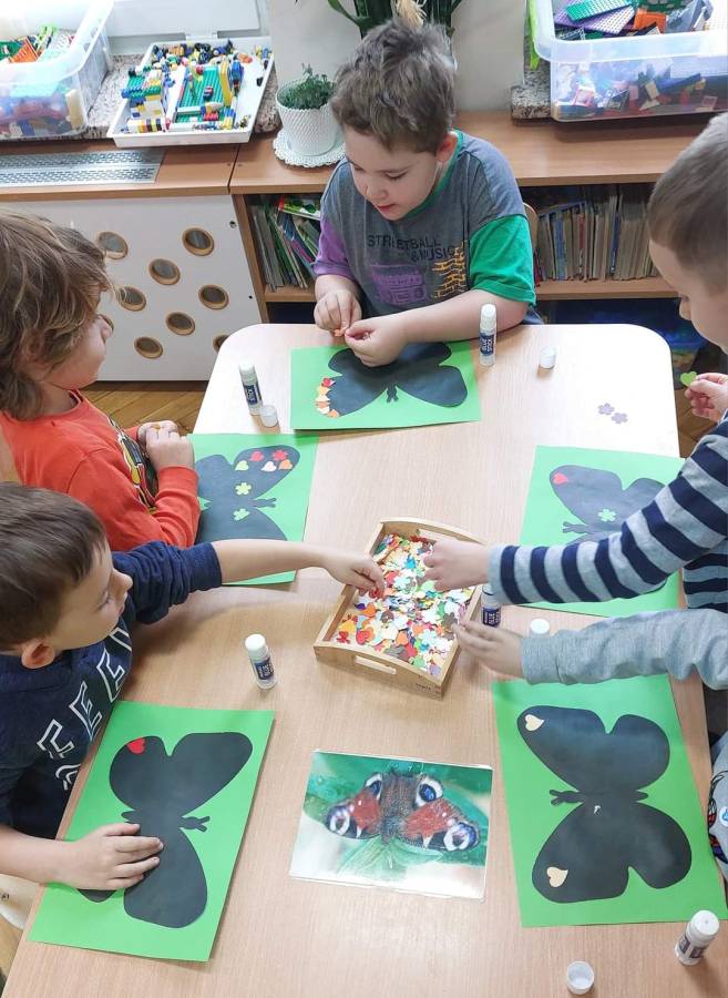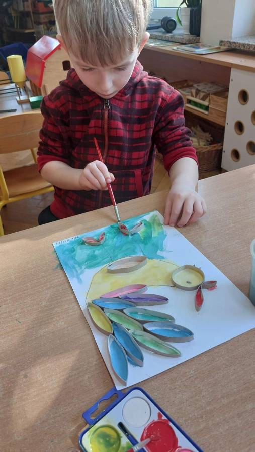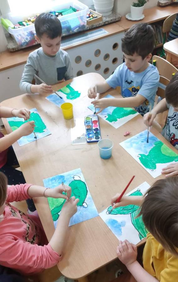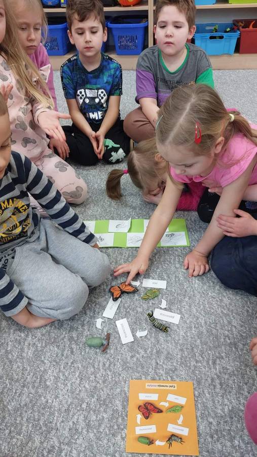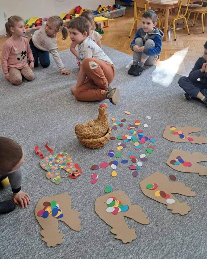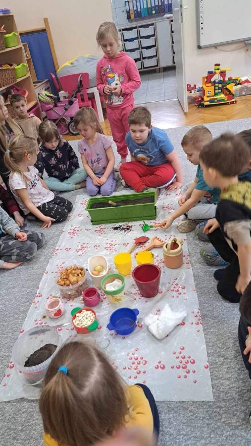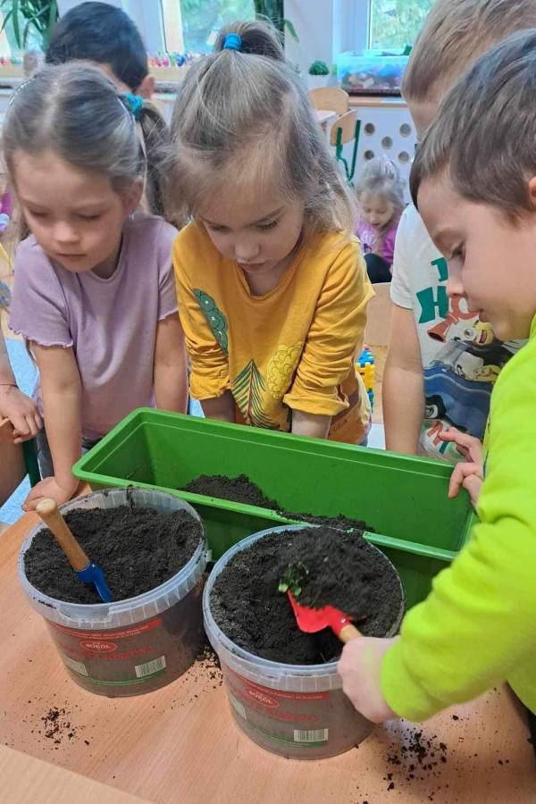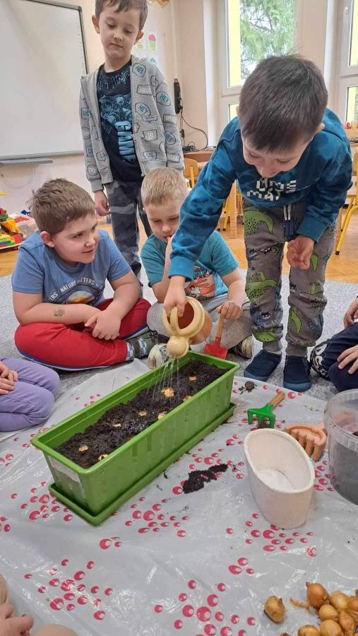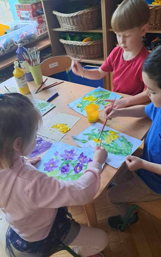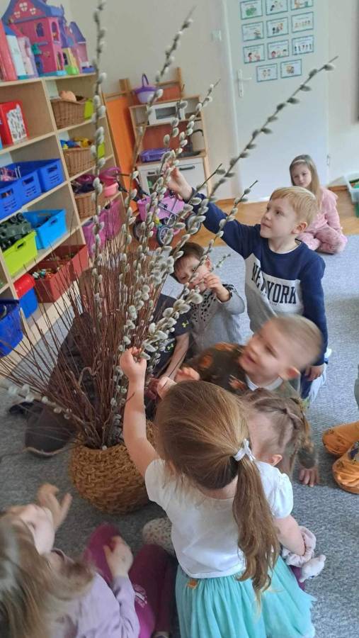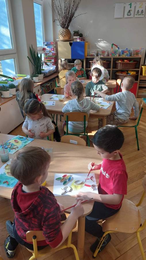 W następnym tygodniu rozmawialiśmy na temat zwierząt mieszkających na wsi. Przedszkolaki potrafiły już rozpoznać niemal wszystkie zwierzęta hodowlane, nie miały też problemu z identyfikacją i podawaniem nazw ich młodych. Przez kolejne dni zgłębialiśmy wiedzę na temat świń, krów, owiec, baranów i kur. Poznaliśmy rośliny i narzędzia ogrodnicze. Szukaliśmy zwiastunów wiosny w najbliższym otoczeniu. Zdobywaliśmy wiedzę na temat warzyw cebulowych. Sadziliśmy cebulę, fasolę i inne roślinki. 21 marca obchodziliśmy Światowy Dzień Zespołu Downa oraz przywitaliśmy wiosnę. Dzieci świetnie poradziły sobie z rozpoznawaniem i podaniem odgłosów wiosny. Zajmowaliśmy się także wiosennymi zwierzętami - motylem i żabą. Poznaliśmy ich cykle życia. Pełen wrażeń był ostatni tydzień marca - świąteczny. Dzieci czekały już na Wielkanoc. Poznały zwyczaje i tradycje Wielkanocne.