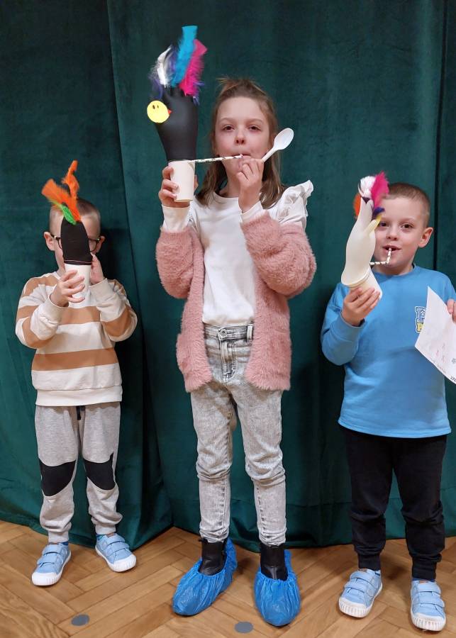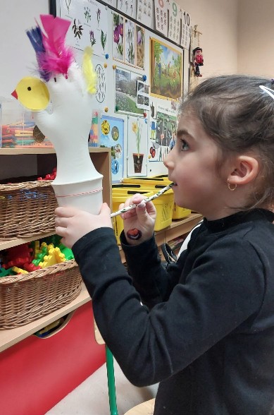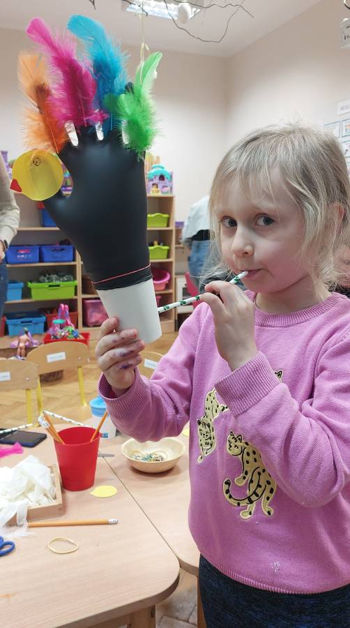 Powstały przepiękne cuda - wianki z papieru, styropianowe pisanki, drewniane jajka sensoryczne, wesołe kurczaki z papierowych talerzyków czy kurki z jednorazowych rękawiczek, które okazały się dodatkowo fantastyczną zabawką do ćwiczeń oddechowych.