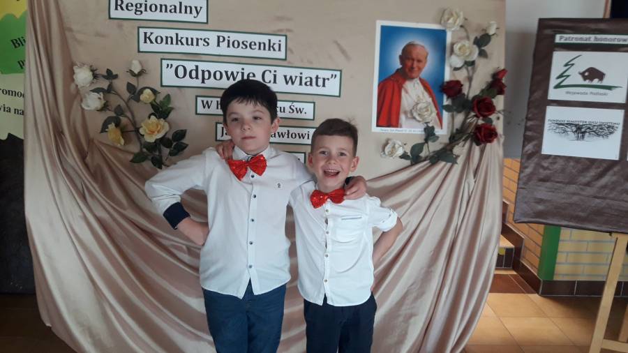 Oprócz tego Mateusz i Andrzej z naszej grupy wzięli udział w konkursie piosenki Odpowie ci wiatr. w hołdzie JPII w SP nr 12 w Białymstoku, zdobywając Wyróżnienie w kategorii duety, co sprawiło nam wielką radość.