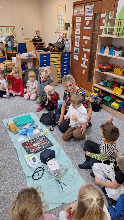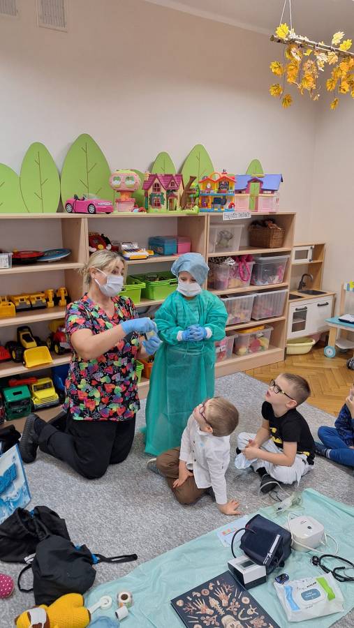 Zdobywcy poznali również zawód weterynarza i wzięli udział w leczeniu pluszowej pandy, stworzyli również własne papierowe rybki do kartonowego akwarium. Rozmawialiśmy również o zawodach jakie możemy wykonywać. Odwiedziła nas Pani Ela, która opowiedziała o zawodzie pielęgniarki. Dzieci rozmawiały również na temat praw i obowiązków dziecka. Dodatkowo uczestniczyli w zajęciach z robotem i dowiedzieli się więcej na ich temat.