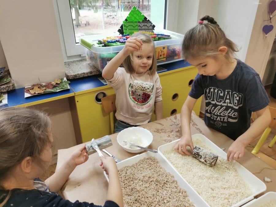 Listopad to czas, by podjąć temat zbliżającej się zimy. Przedszkolaki rozwiązywały zagadki o zwierzętach leśnych. Dowiedziały się, w jaki sposób różne zwierzaki przygotowują się do zimy. Odkryły, że niektóre z nich zapadają w sen zimowy, inne hibernują czy chowają się np. pod liśćmi. Dowiedziały się, jak i czym dokarmiać zwierzęta zimujące w Polsce oraz czym różni się karmnik od paśnika. Wykonały indywidualne karmniki z tekturowych rolek, smalcu i ugotowanych kasz, które zawisły w przydomowych ogródkach.