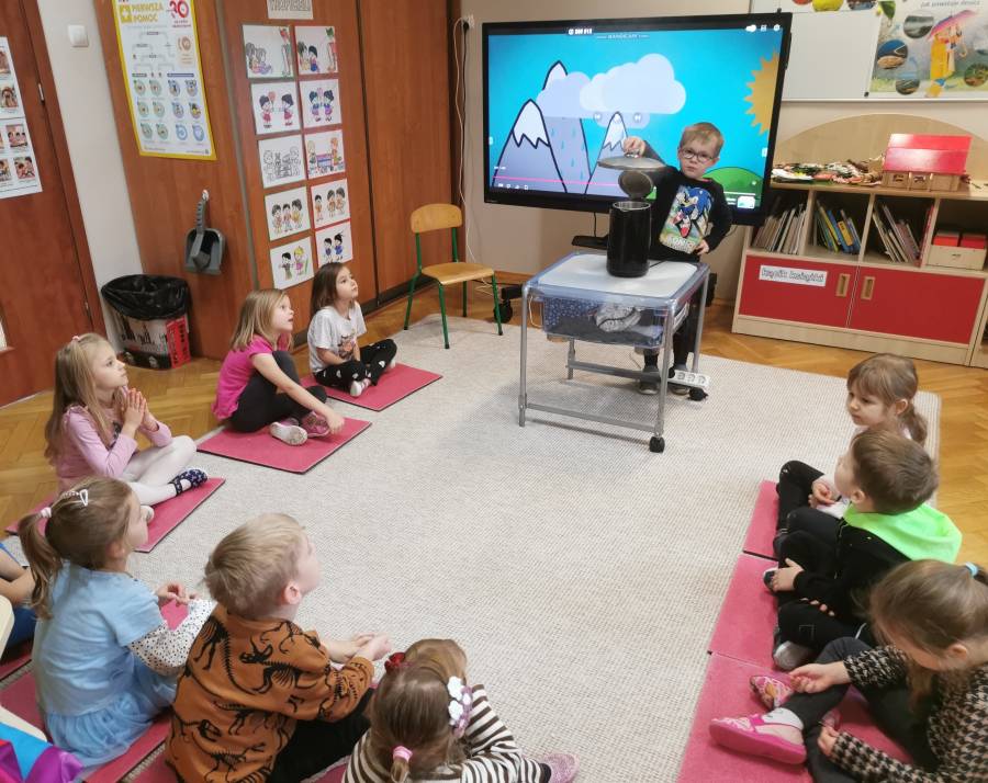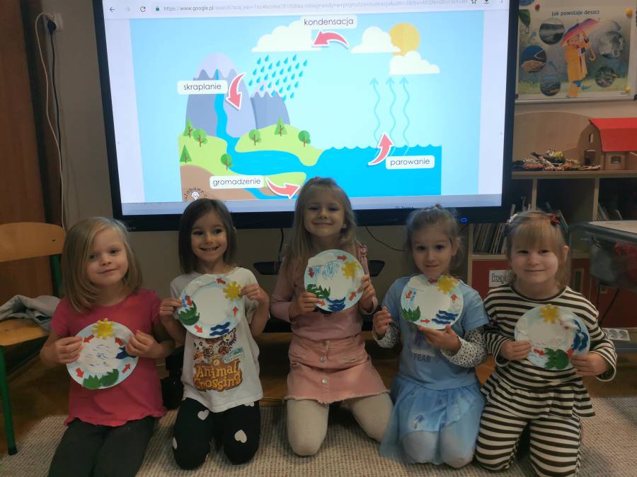 W listopadzie Tropiciele poszerzyły swoją wiedzę na temat chmur, ich rodzajów i procesu ich powstawania. Przeprowadziły eksperyment, by obserwować proces parowania wody i skraplania się pary wodnej. Sprawdzały też co pływa, a co tonie. Stawiały hipotezy i je potwierdzały. Dzieci dowiedziały się, skąd się bierze deszcz i stworzyły model obiegu wody w przyrodzie w formie pracy plastyczno-technicznej. Zakupiony przez Panią Dyrektor kalendarz pogody pozwoli im stawać się coraz baczniejszymi obserwatorami zmian zachodzących w przyrodzie, a więc także uwrażliwi ich na otaczający świat.