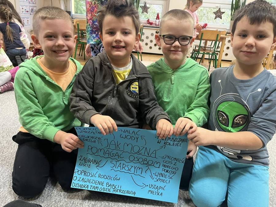 W styczniu Zdobywcy obchodzili również dwa bardzo ważne święta- Dzień Babci i Dzień Dziadka. Z tej okazji przygotowali występ dla swoich kochanych babć oraz dziadków, wykonali prace plastyczne przy użyciu bibuły, rozmawiali też o tym jak mogą sami pomagać starszym osobom.