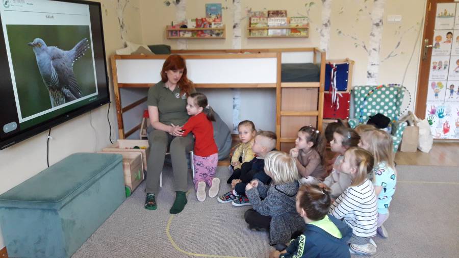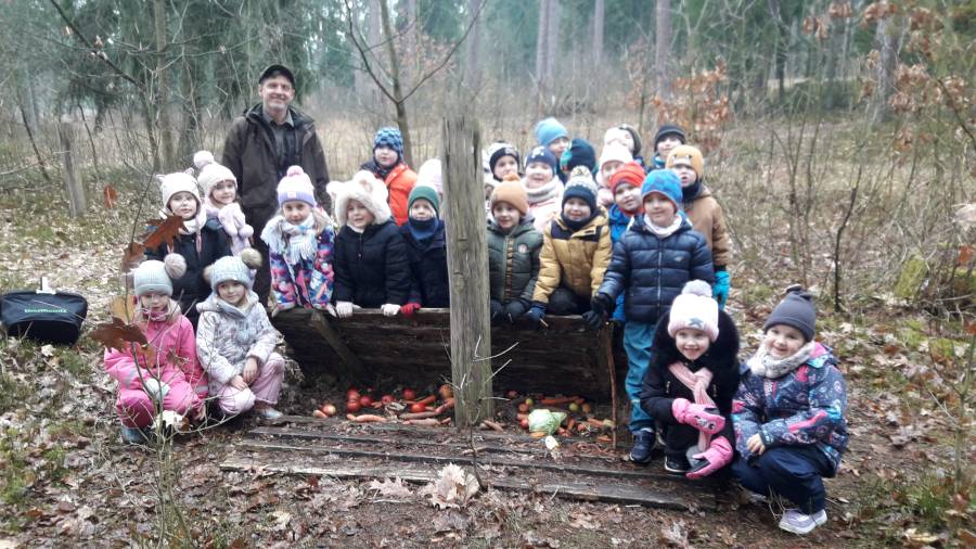 W zimowym miesiącu- lutym Pszczółki pamiętały o dokarmianiu zwierząt. W tym celu wspólnie z edukatorem leśnym p. Kasią zrobiły kulki z ziarnami dla ptaków. Odwiedziły leśny paśnik i zaniosły sarenkom warzywa i owoce.