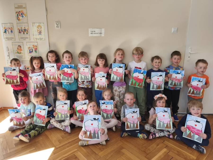 Mróweczki w maju w związku z obchodami Święta Konstytucji 3-go Maja przypomniały sobie jakie mamy symbole narodowe. Dzieci uczyły się Hymnu Polski. Dowiedziały się gdzie znajduje się na mapie Polski stolica oraz ich miasteczko Supraśl. Zobaczyły jak długa jest Wisła.