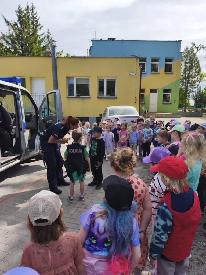 Dzieci uczestniczyły również w spotkaniu z Panią Policjantką. Dowiedziały się jak należy zachowywać się podczas wakacji by być bezpiecznym oraz jakie zadania do wykonania ma Policja.