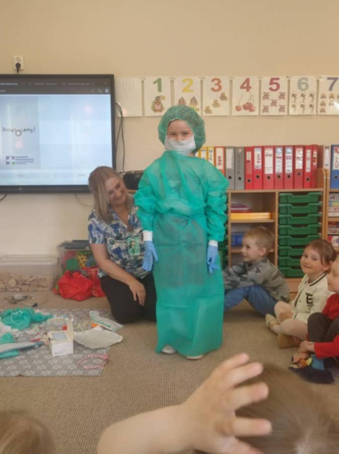W maju obchodziliśmy Dzień Pielęgniarek. W tym dniu odwiedziła dzieci Pani Ela i opowiedziała im jak wygląda ten zawód oraz przedstawiła niezbędne rekwizyty potrzebne do wykonywania jej pracy.