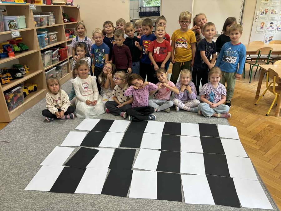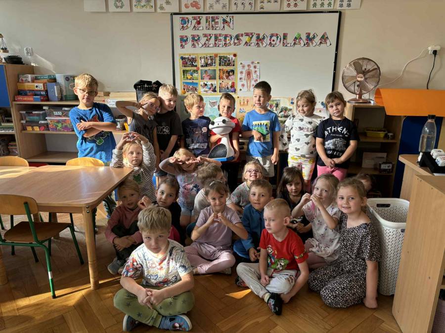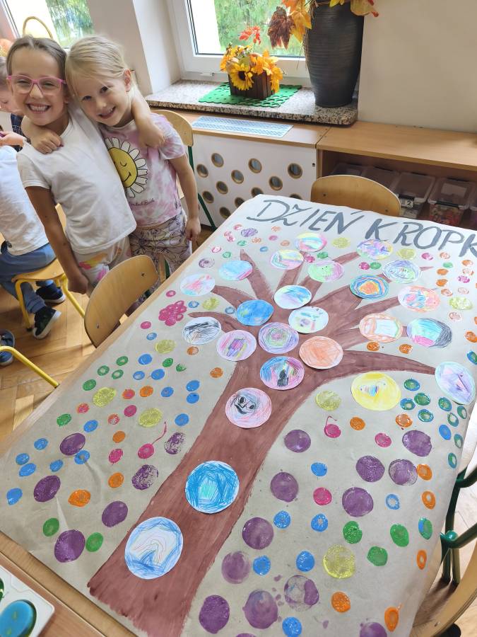 W tym miesiącu obchodziliśmy Dzień Przedszkolaka, który był pełen radości, tańców i niespodzianek, oraz Międzynarodowy  Dzień Kropki - z tej okazji wykonaliśmy wspólny plakat, ozdobiony kolorowymi kropkami.