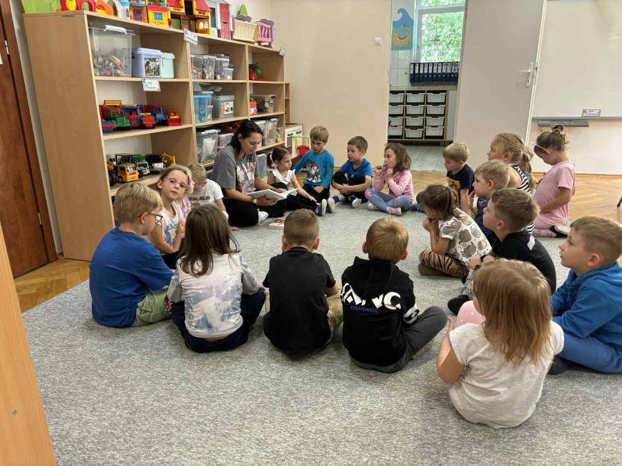 Rozpoczęliśmy również cykliczne wizyty w bibliotece, gdzie dzieci z zainteresowaniem słuchały opowieści czytanych przez panią bibliotekarkę oraz wypożyczały książki do domu.