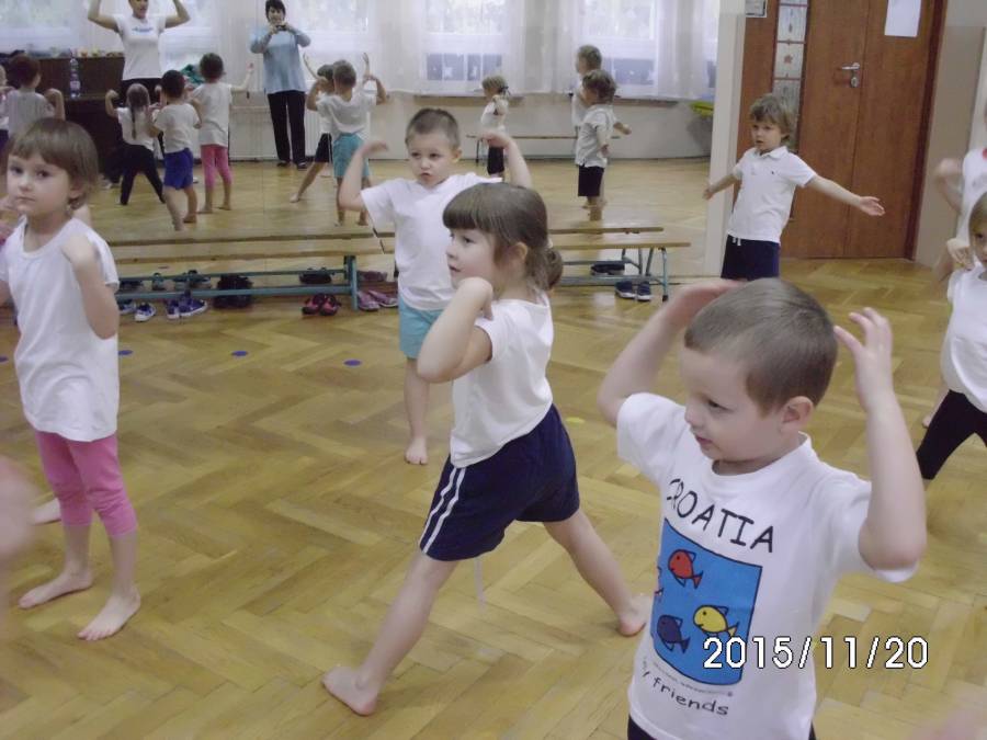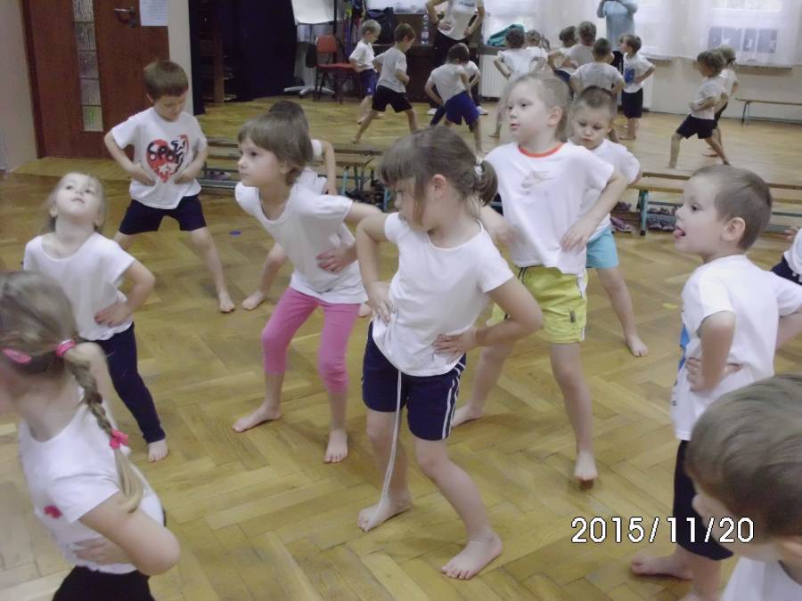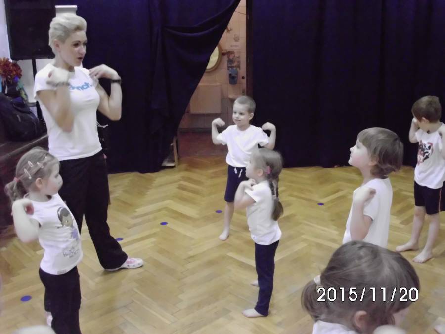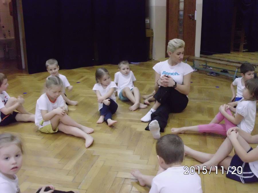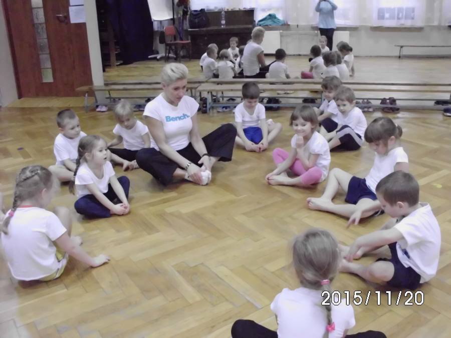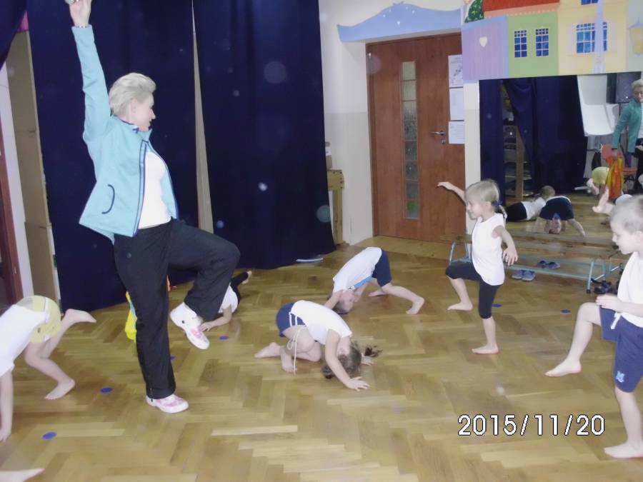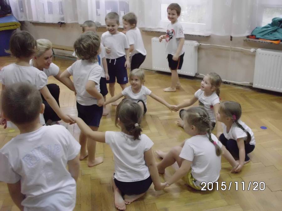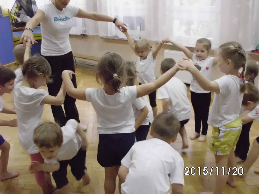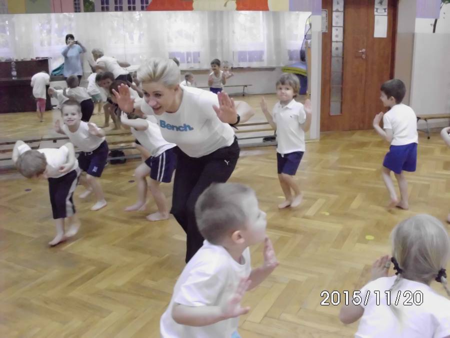 Potrafimy się wesoło bawić, ale również ćwiczyć z ochotą na zajęciach ruchowych. Pani Madzia wymyśla nam fajne zabawy, pokazuje różne ćwiczenia! Nawet czasami, na zakończenie zajęć, nasze panie bawią się z nami w berka!