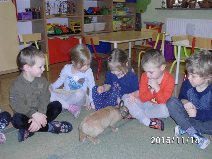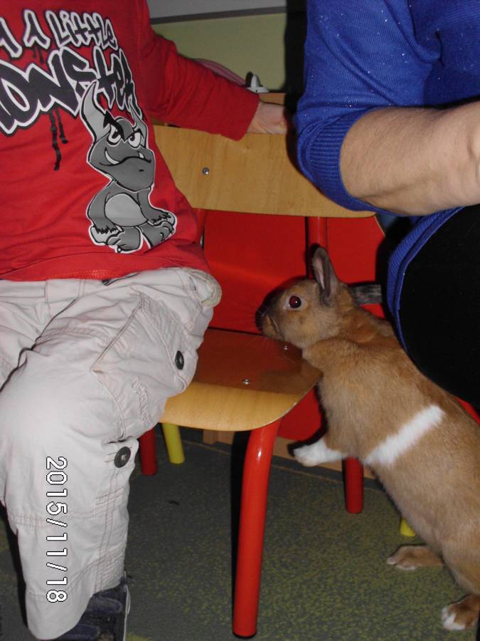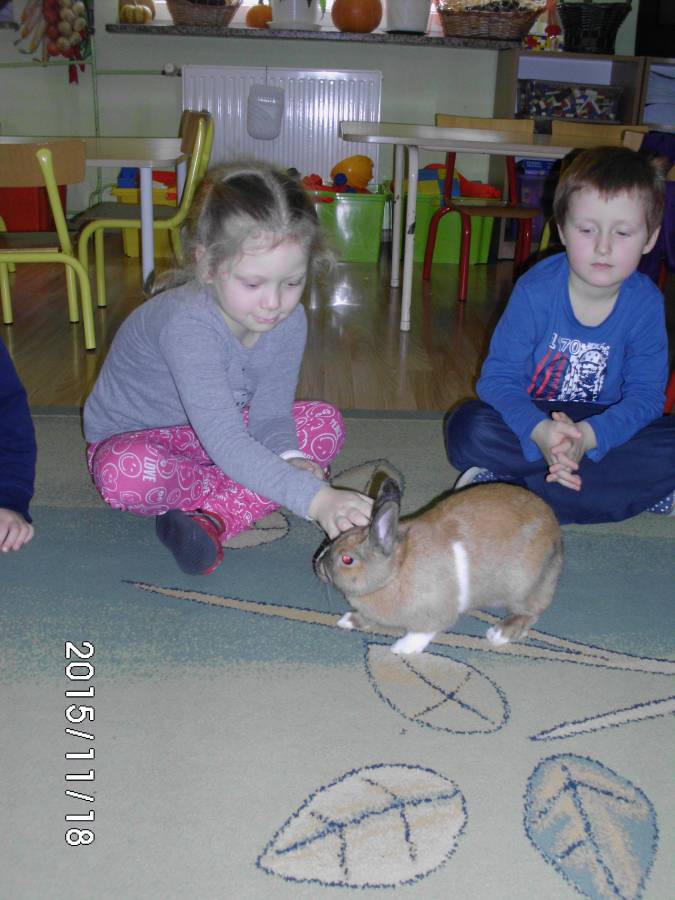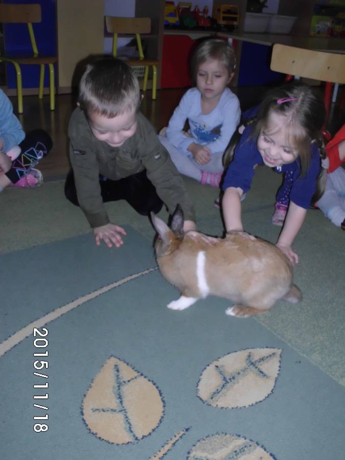 Również do grupy elfików zawitał gość - domowy królik. Dzieci z ochotą słuchały, jak należy opiekować się zwierzątkiem.