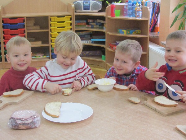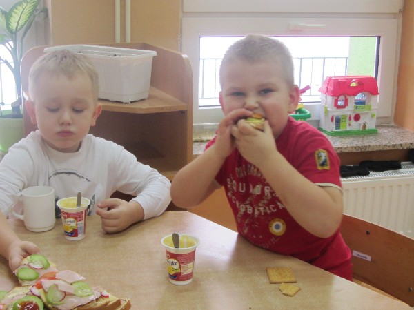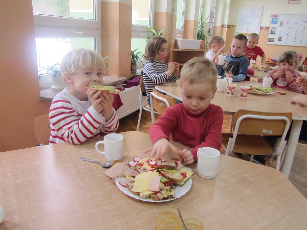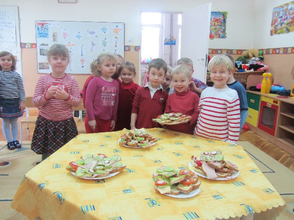 26 lutego dzieci wykonały samodzielnie najsmaczniejsze i najbardziej kolorowe kanapki. Po starannym umyciu rąk oraz po przygotowaniu stanowisk pracy zabrały się do pracy. Na stole pojawiło się pieczywo, masło, wędlina, ser, rzodkiewka, ogórek, pomidor. Własnoręcznie zrobione kanapki bardzo smakowały, a przy tym doskonale wszyscy się bawili.