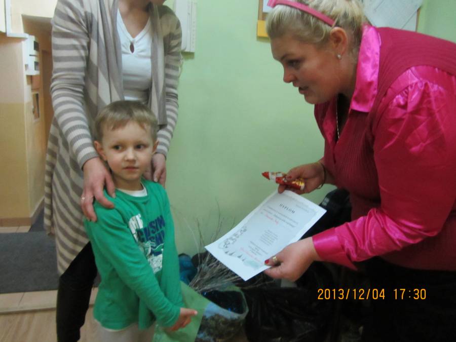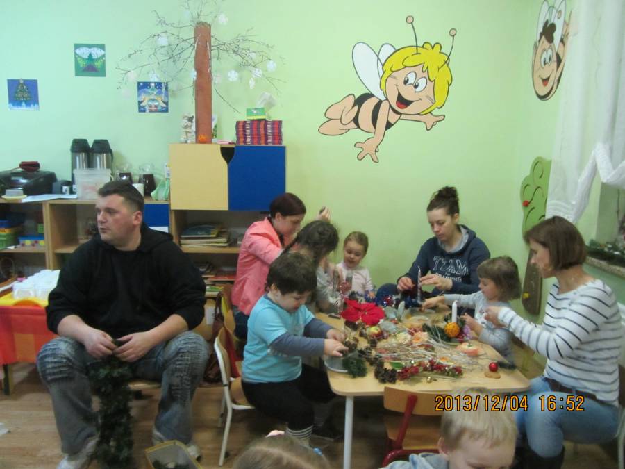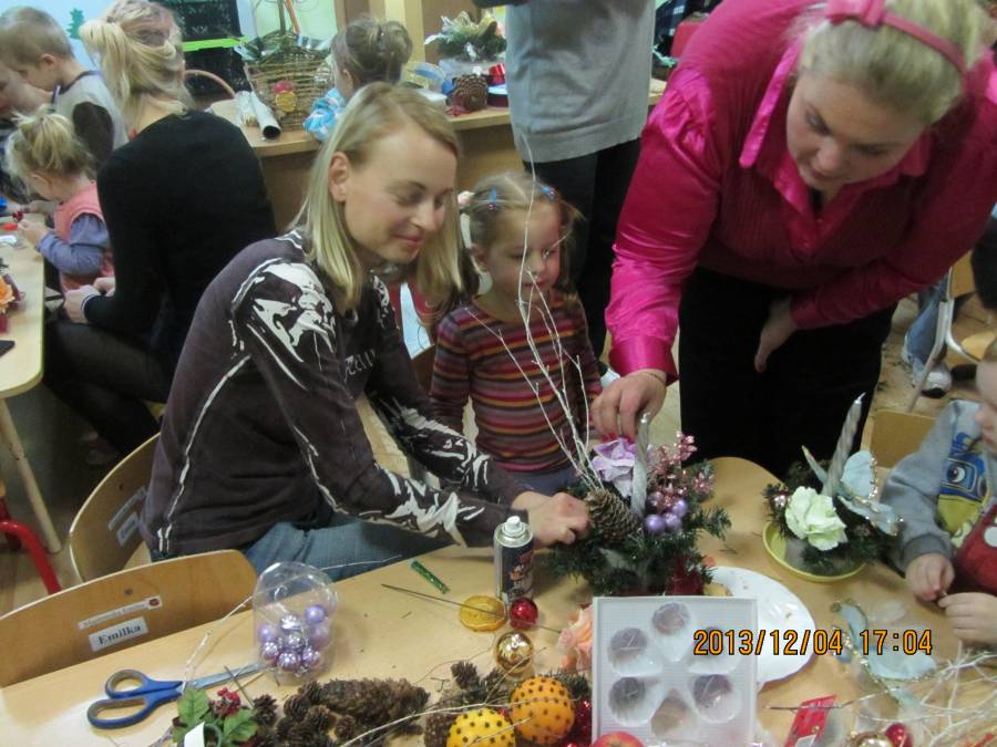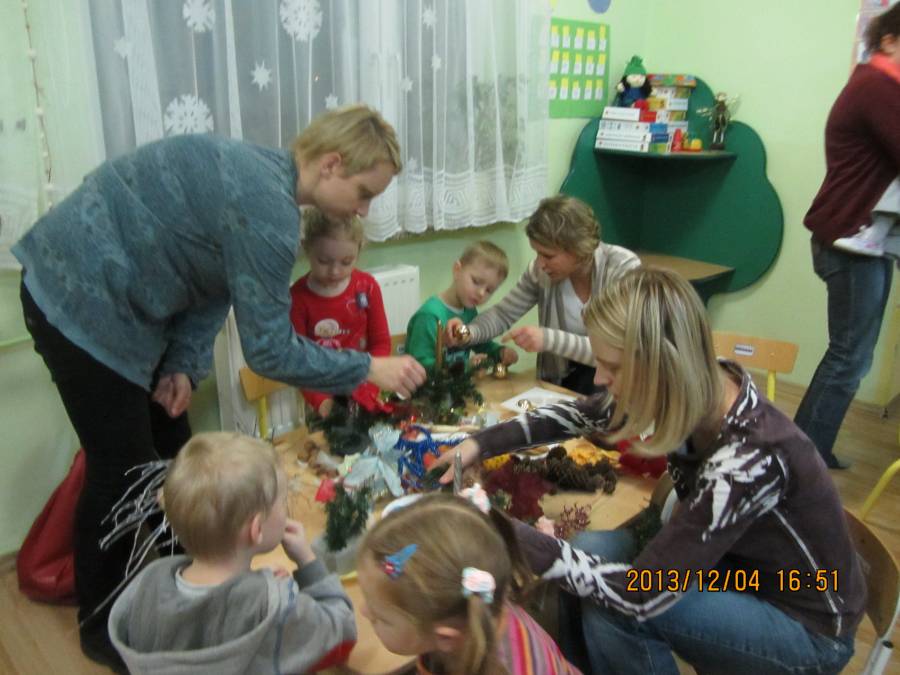 Pod fachowym okiem p. Sylwii rodzice wraz z dziećmi wykonali świąteczne stroiki, które zabrali do swoich domów. Wszyscy uczestnicy spotkania otrzymali dyplomy oraz czekoladowego Mikołaja.