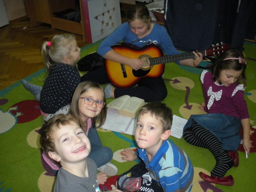 Nasza wolontariuszka Zuzia umilała dzieciom przedświąteczny czas wspólnym śpiewem kolęd przy akompaniamencie gitary