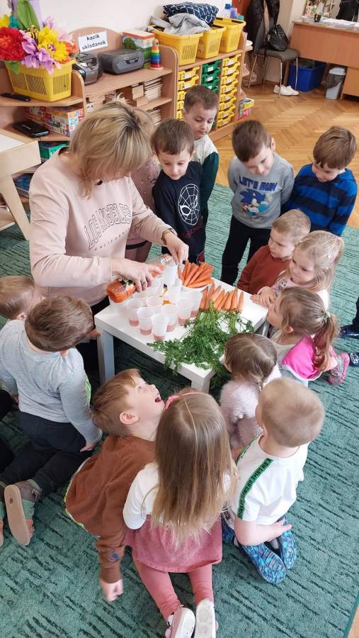 W tym miesiącu obchodziliśmy Światowy Dzień Świadomości Autyzmu, Dzień Marchewki oraz Dzień Ziemi. Spotkaliśmy się z rodzicami w przedszkolu, aby wspólnie wykonać ozdoby świąteczne. Efektem wspólnej pracy były piękne palmy , zające , kury i jajka wielkanocne. Gościliśmy aktorów Teatru Pod Orzełkiem z przedstawieniem pt,,Kukła z wiejskiego podwórza ".