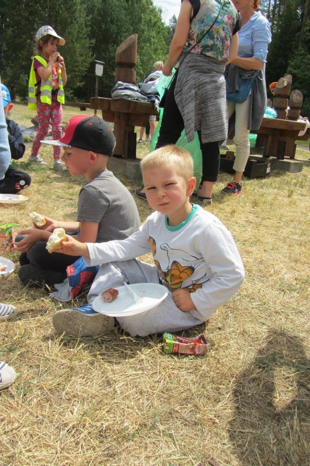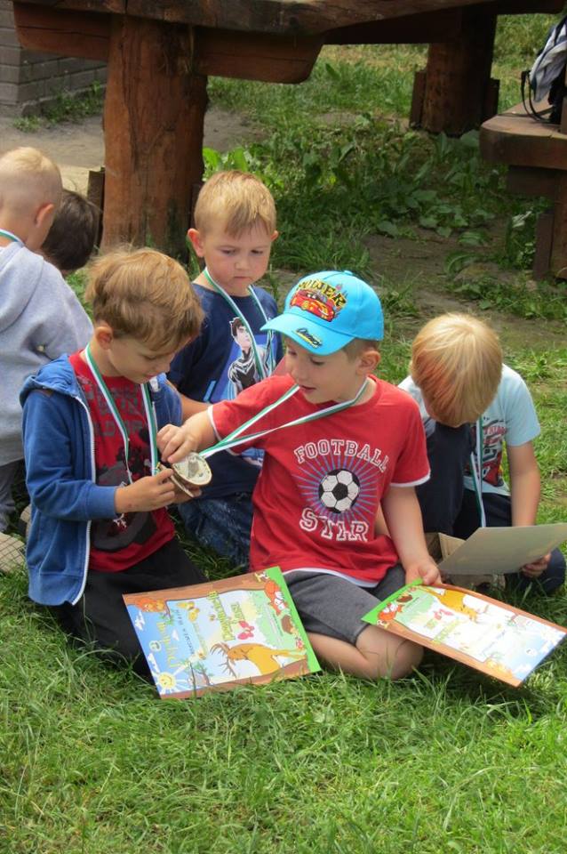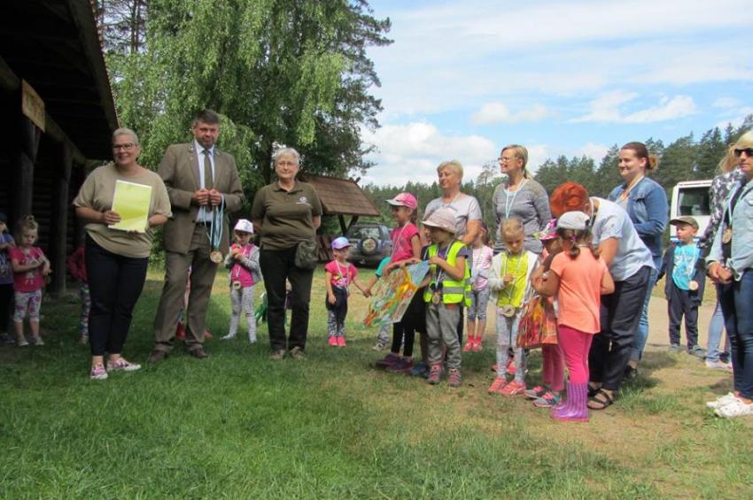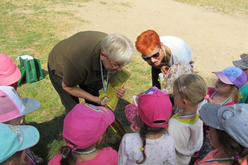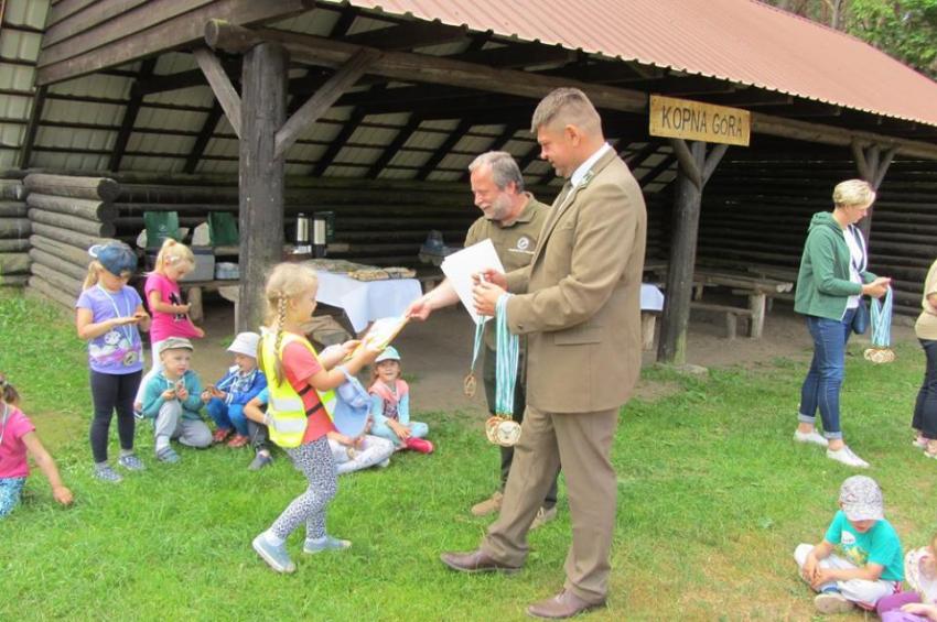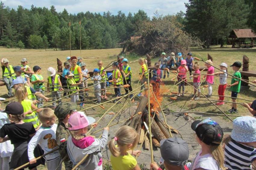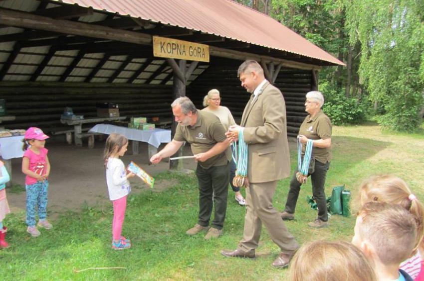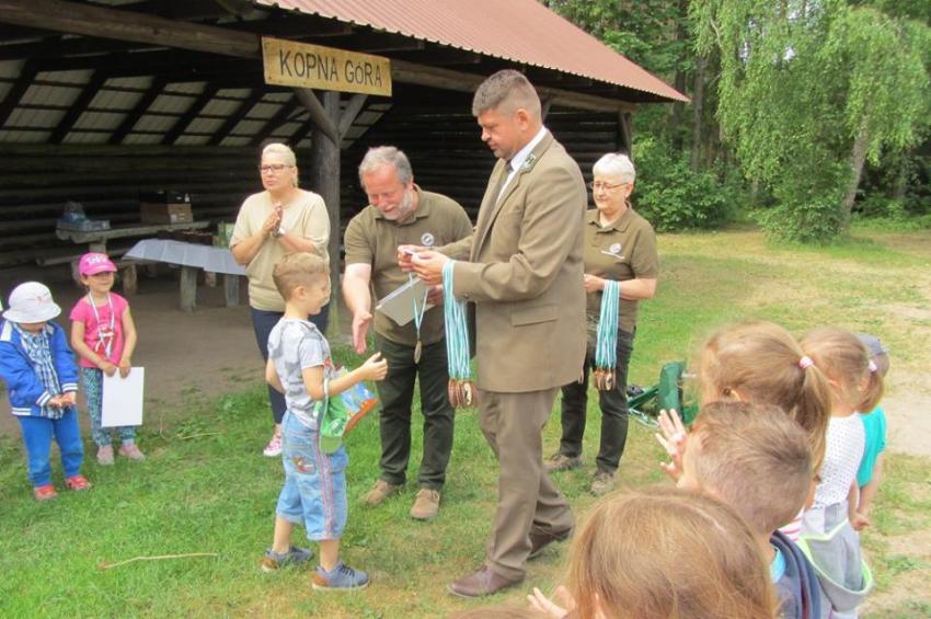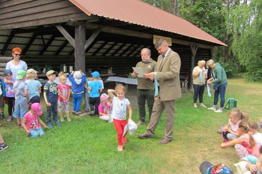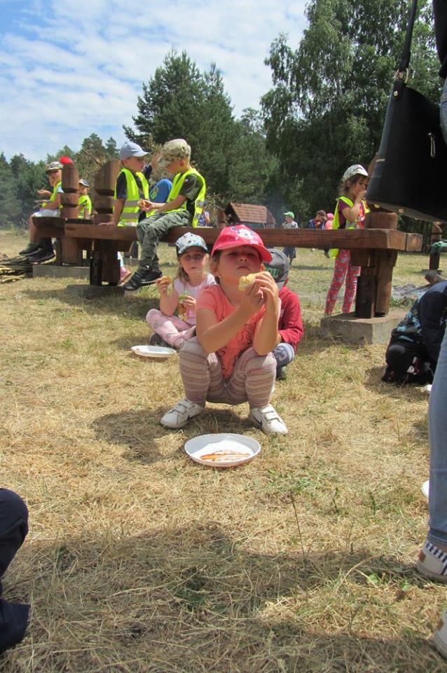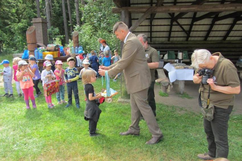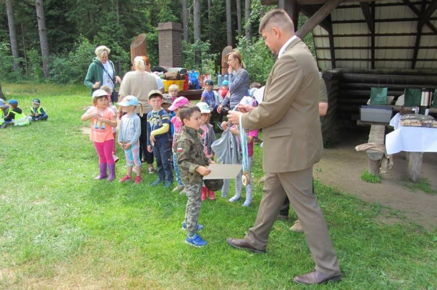 Pracownicy Lasów Państwowych zorganizowali naszym wychowankom pożegnalne ognisko – nie zabrakło kiełbasek i słodyczy, ale także dyplomów, medali i prezentów tematycznie związanych z lasem i jego mieszkańcami. Leśnicy w ten sposób podziękowali przedszkolakom za systematyczną naukę o ochronie przyrody na terenie Arboretum. Dzieci odwdzięczyły się pamiątkowymi pracami plastycznymi, tańcem i piosenką. Tym razem na ogromnej polanie przedszkolaki zajmowały się tylko zabawami ruchowymi, a edukacja przyrodnicza została odłożona do przyszłego roku.