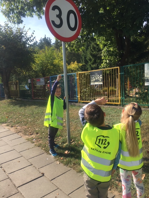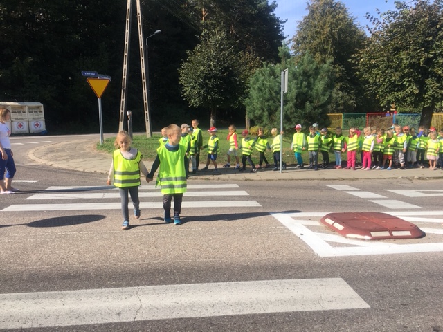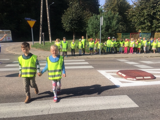 Dzieci z grupy "Pszczółek" przypominały zasady ruchu drogowego i prawidłowego przechodzenia przez jezdnię. Nazywały też znaki drogowe w najbliższym otoczeniu.