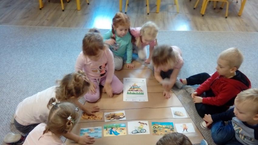 W tym tygodniu dzieci z grupy "Kaczuszek" dowiedziały się jak dbać o zdrowie. Dzieci poznały piramidę zdrowego żywienia i aktywnosci fizycznej, dowiedziały się co znaczy wyrażenie zdrowe odżywianie. Uczyły się okreslać co jest zdrowe,a co nie. Dowiedziały się także jak ważny dla zdrowia jest ruch. Wykonały również pracę plastyczną "Jabłka w słoiku".