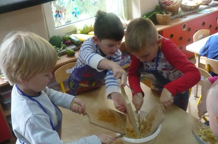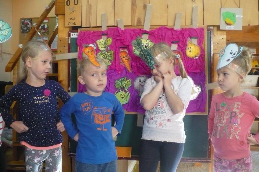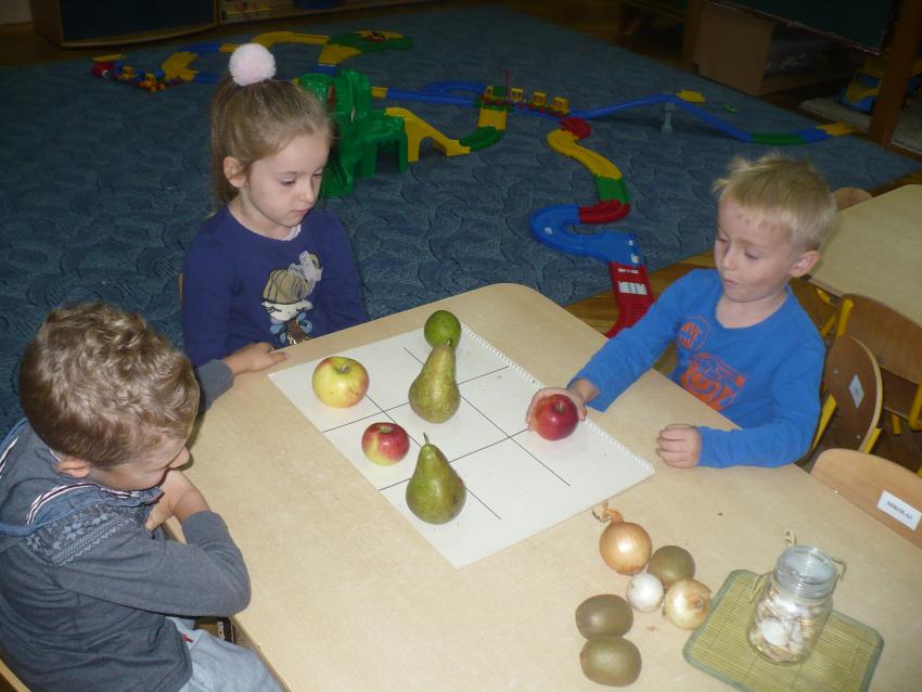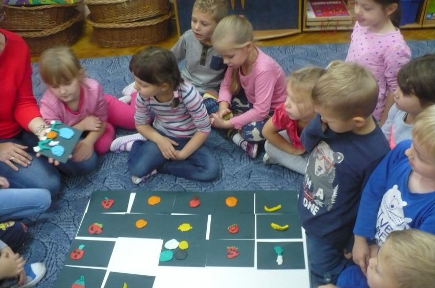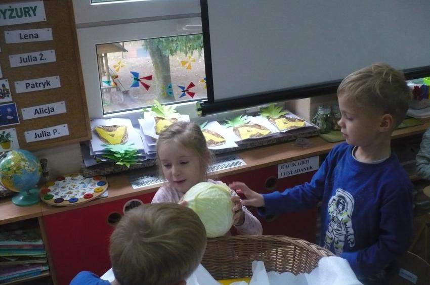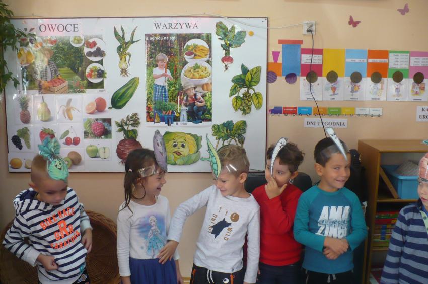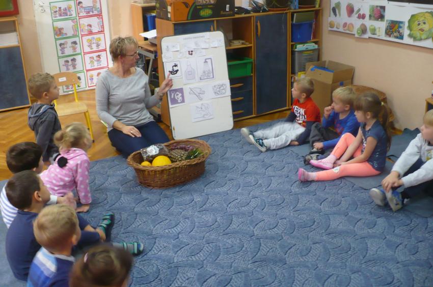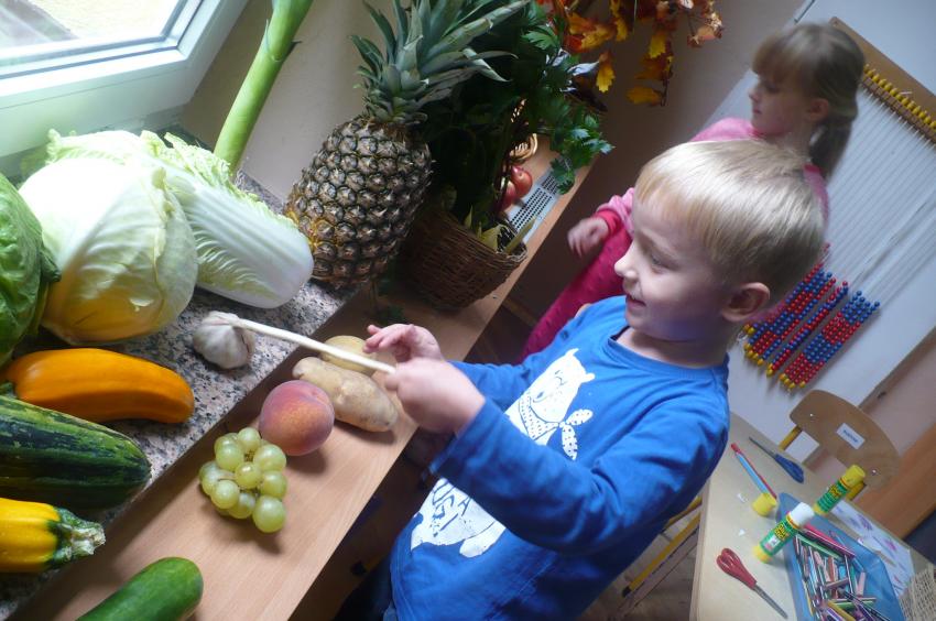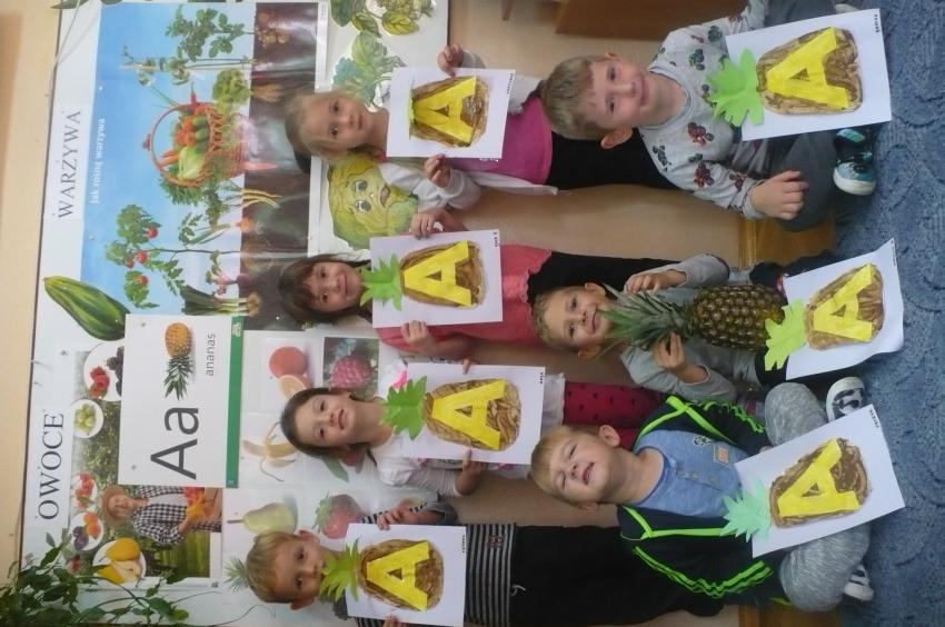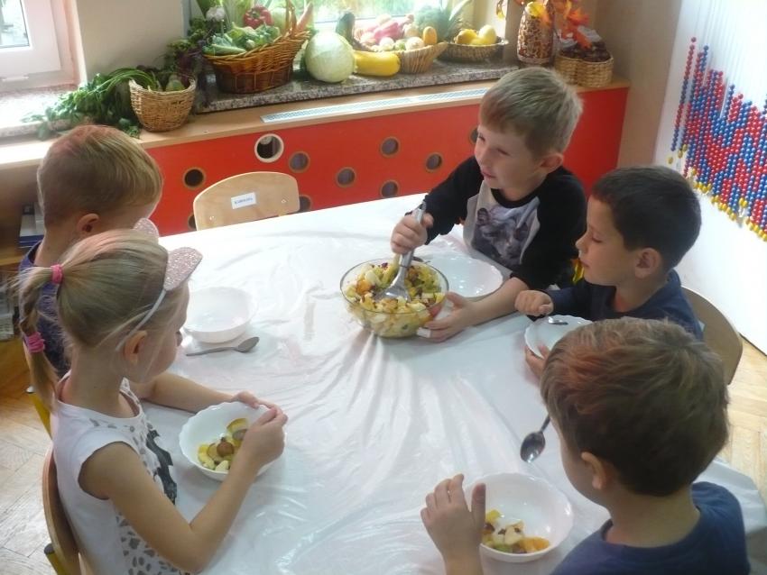 W tygodniu zatytułowanym „Dary jesieni” zajmowaliśmy się warzywami i owocami zarówno typowo jesiennymi, jak i dojrzewającymi podczas innych pór roku i rosnącymi w innych strefach klimatycznych. Usystematyzowaliśmy wiedzę na temat jadalnych części warzyw, ich systemów korzeniowych. Doskonaliliśmy umiejętności opisu a także rozróżniania warzyw i owoców za pomocą zmysłu dotyku, węchu i smaku. „Dzięki” ananasowi nauczyliśmy się kolejnej literki: A, a. Podsumowaniem całego tygodnia było zadanie kulinarne. Samodzielnie przeczytaliśmy przepis zapisany w formie pigtogramów a następnie krok po kroku wykonaliśmy sałatkę owocową, która była naprawdę wyśmienita.