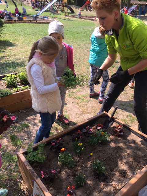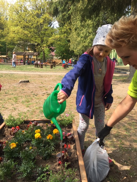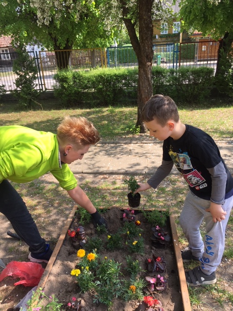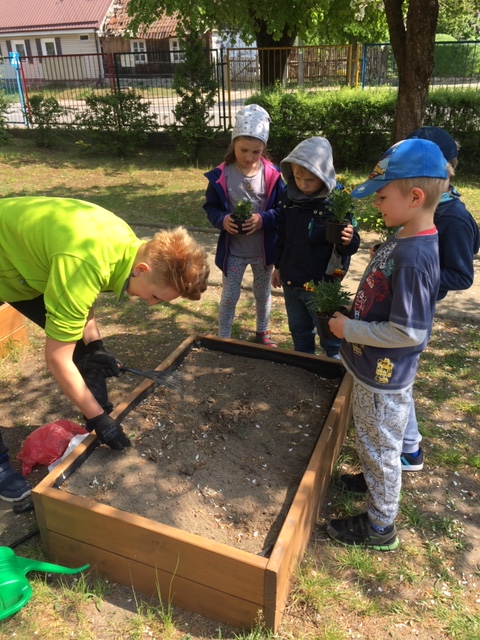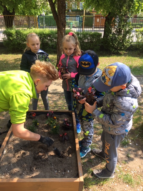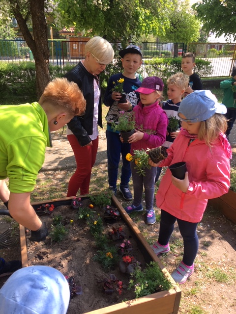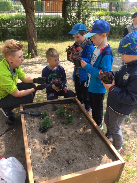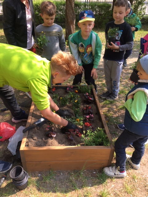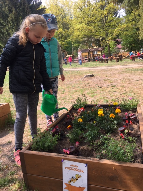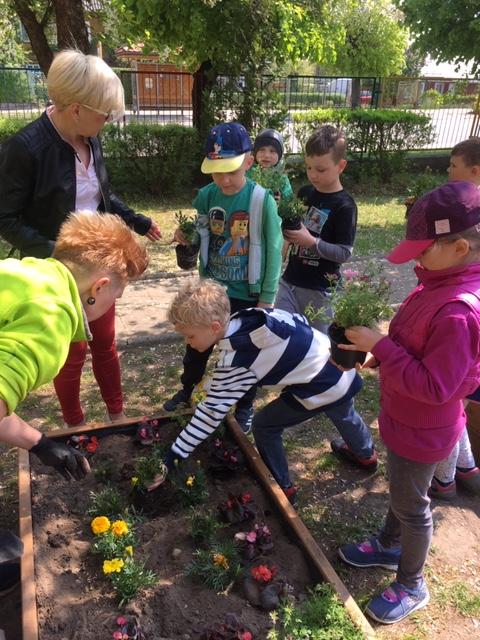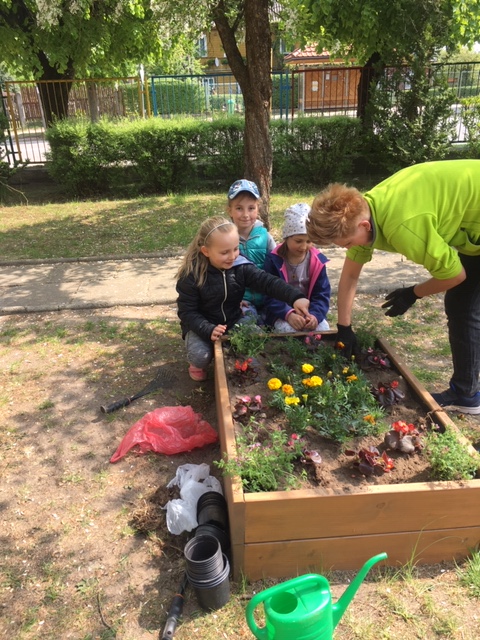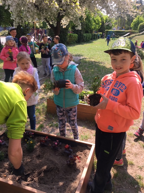 Pszczółki zadbały o swój kwietnik na placu przedszkola. Pod okiem mamy Patryka posadziły kwiatki. Pani Ela pokazała dzieciom jak prawidłowo sadzi się roślinki. Każde dziecko posadziło swoją sadzonkę. Trzeba było jeszcze zapamiętać nazwę posadzonej roślinki. Kazda Pszczółka była dumna z siebie.
