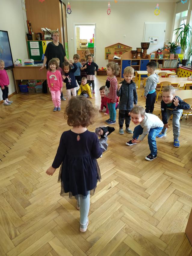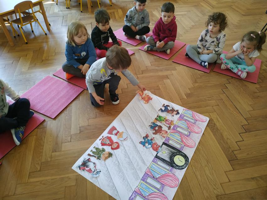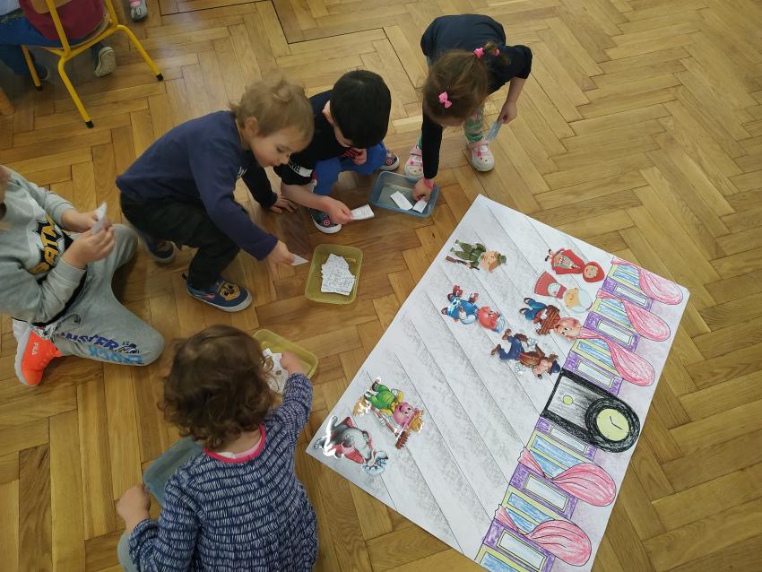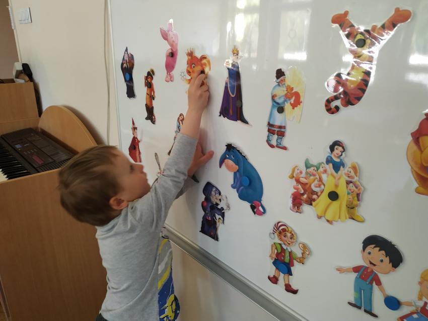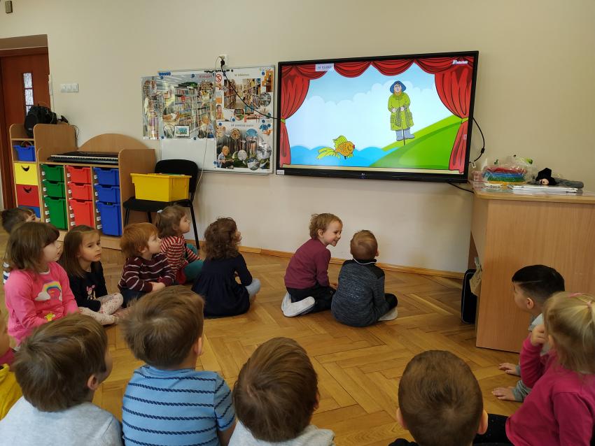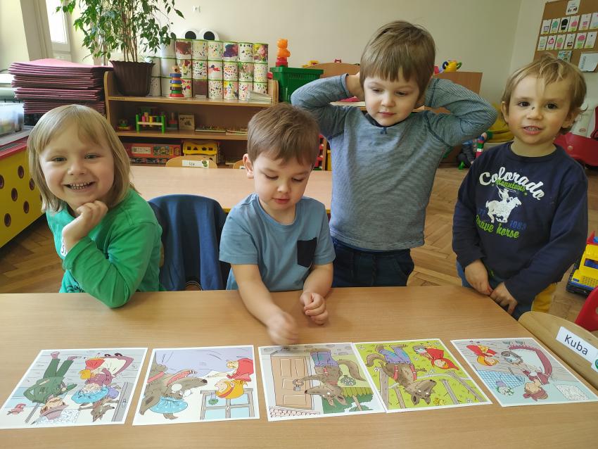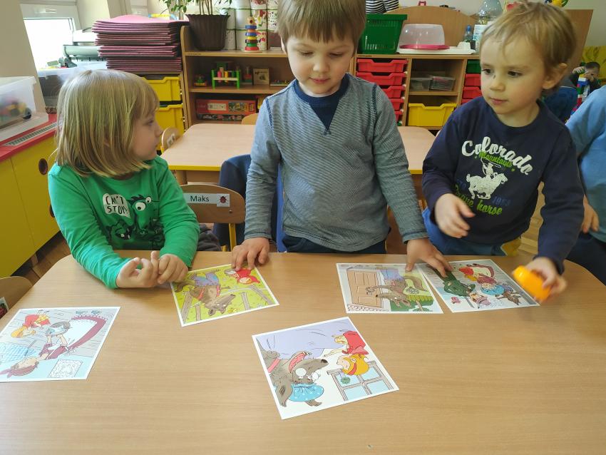 Dowiedzieliśmy się, skąd się biorą bajki? Uczyliśmy się oglądać/słuchać bajki ze zrozumieniem. „Czytaliśmy” książki i szukaliśmy w nich znanych opowieści, rozpoznawaliśmy bohaterów. Braliśmy udział w różnych zabawach o tematyce bajkowej - „Raz, dwa, trzy, Baba Jaga patrzy”, „Rybak i złote rybki”, a także wcielaliśmy się w role poznanych bohaterów, tworząc teatrzyk, rozwiązywaliśmy zagadki, układaliśmy puzzle, odgadywaliśmy tytuły bajek na podstawie obrazków. Układaliśmy i opowiadaliśmy historyjki obrazkowe zgodnie z chronologią zdarzeń, dzięki czemu uczyliśmy się opowiadać bajki. Ćwiczyliśmy odróżnianie świata rzeczywistego od bajkowego, co dla nas nie jest jeszcze oczywiste.