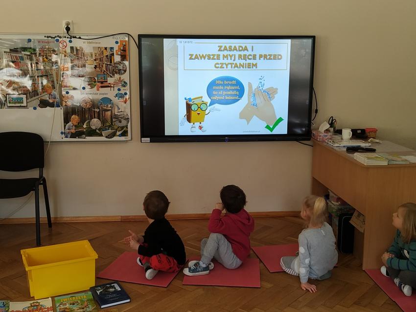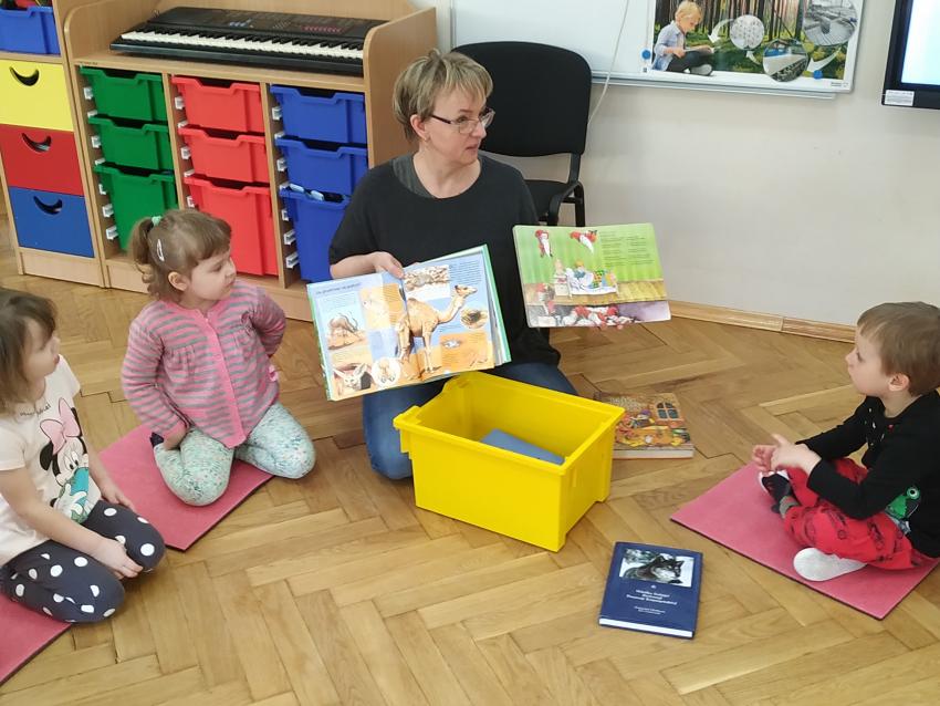 Rozmawialiśmy o czytaniu książeczek i o tym, czym różni się biblioteka od księgarni. Oglądaliśmy książki – sprawdzaliśmy, co zawierają (okładka, strony, tekst, ilustracje). Dowiedzieliśmy się, jak różne tematy mogą poruszać. Poznawaliśmy zasady korzystania z książek, potrzebę dbania o nie.