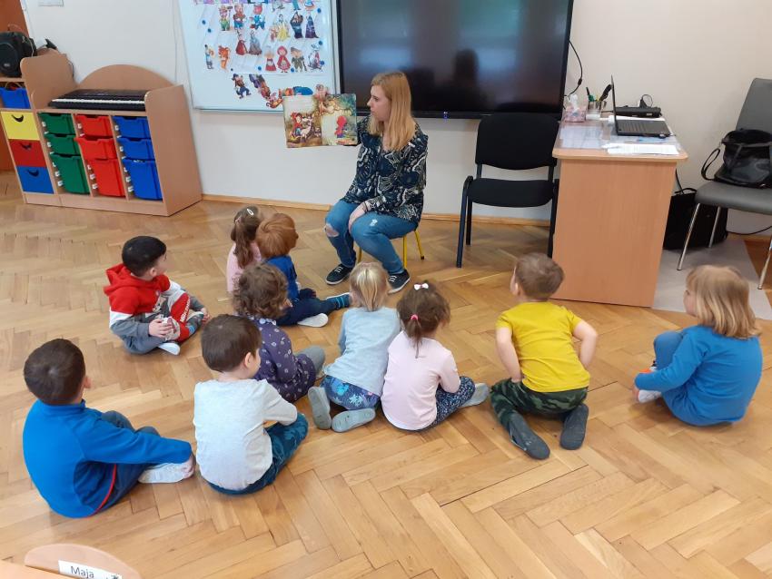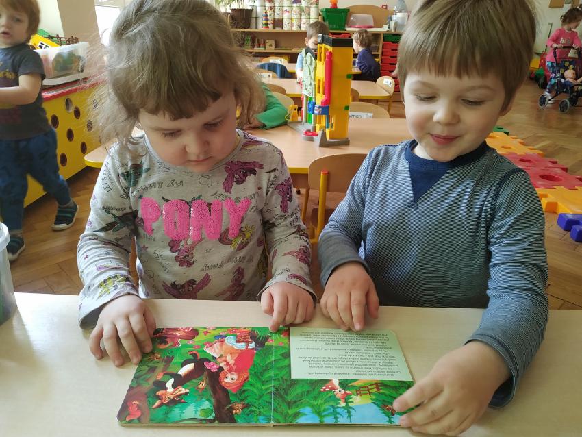 Aby zachęcić maluchy do oglądania (a w przyszłości czytania) książek, rozmawialiśmy o baśniach i bajeczkach, ucząc się dzięki temu wypowiadać w sposób zrozumiały dla otoczenia i słuchać, kiedy mówią inni. Pretekstem do poznawania bajek był bal dla mieszkańców Bajkowego Królestwa, na który sukcesywnie zapraszaliśmy bohaterów następujących bajek: o Jasiu i Małgosi, Kopciuszku, Czerwonym Kapturku, Królewnie Śnieżce i siedmiu krasnoludkach, Trzech świnkach oraz o Rybaku i złotej rybce.