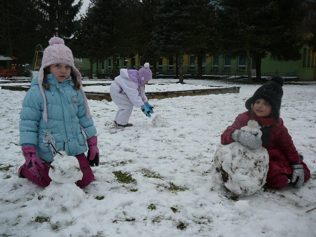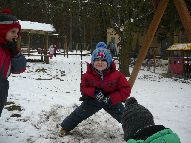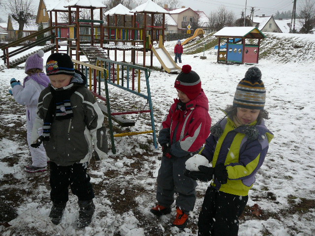 Po tak wyczerpujących zadaniach warto wesoło i wspólnie pobawić się na śniegu w przedszkolnym ogrodzie.