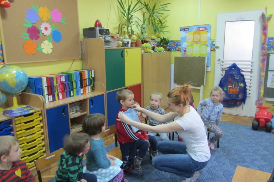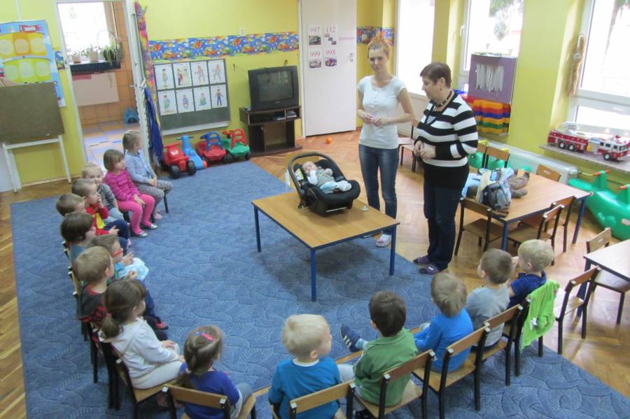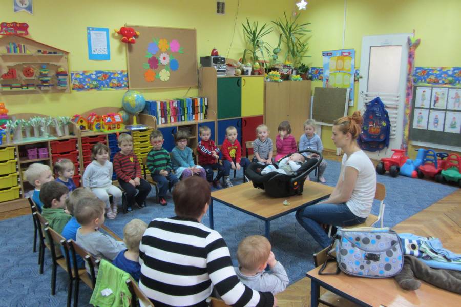 Grupę Krasnoludków odwiedziła p. Marysia wraz ze swoim malutkim synkiem Jasiem, braciszkiem Mateusza. Maluchy chętnie i z zainteresowaniem słuchały jak należy opiekować się młodszym rodzeństwem.