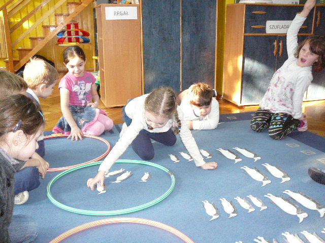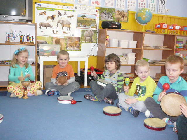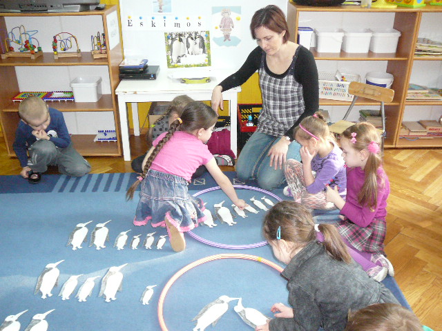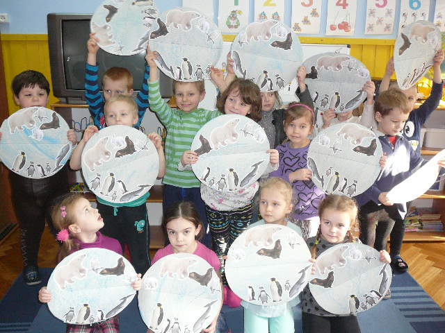 Poznajemy mieszkańców kół podbiegunowych - ćwiczenia w przeliczaniu i klasyfikowaniu na przykładzie pingwinich rodzinek oraz zapoznanie z podstawowymi instrumentami afrykańskimi (bębenki i grzechotki) - tworzenie własnych rytmów afrykańskich z podziałem na role.