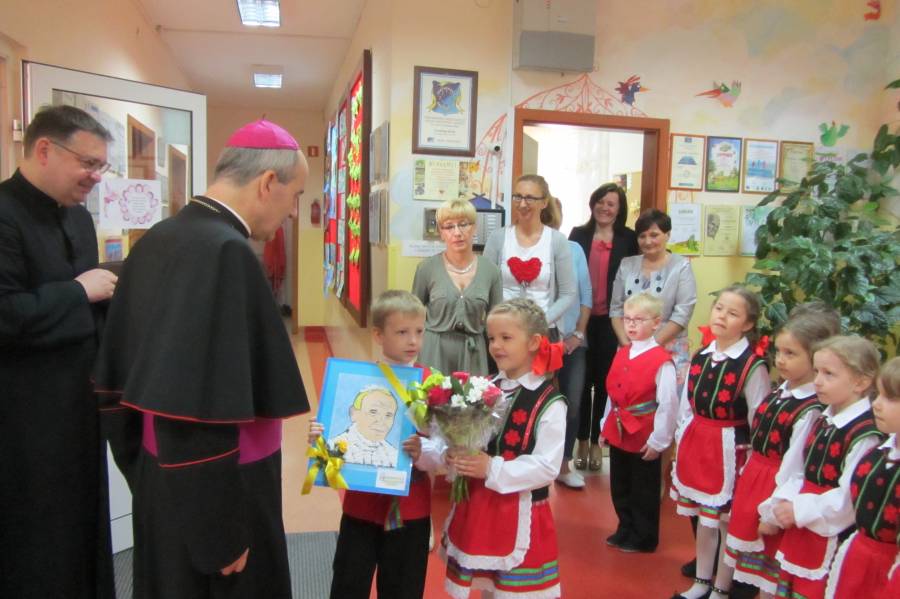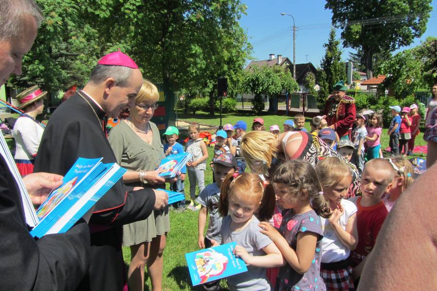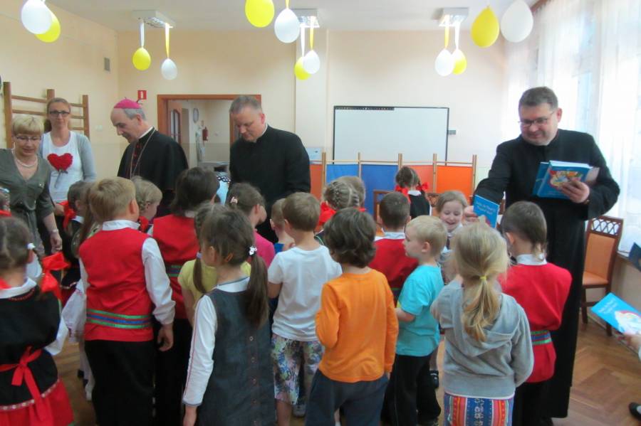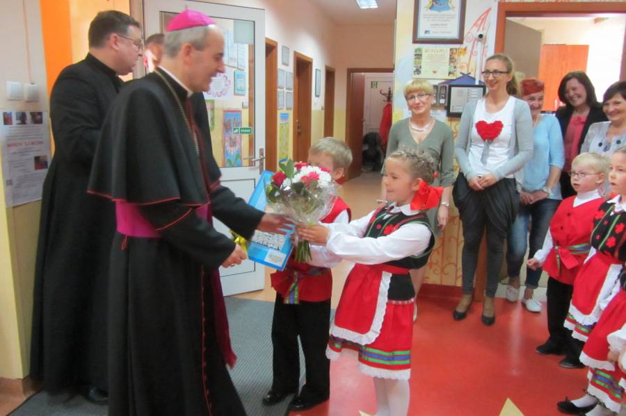 01 czerwca 2015r. nasze przedszkolaki odwiedził gość specjalny - Jego Ekscelencja Ksiądz Biskup Henryk Ciereszko. Przedszkolaki ochoczo przywitały gościa, wręczając mu skromny upominek, po czym zaprosiły do obejrzenia tańca "Na krakowskim rynku" w wykonaniu najstarszej grupy - Gumisie. Ksiądz Biskup pobłogosławił nasze przedszkolaki, złożył im najserdeczniejsze życzenia z okazji Dnia Dziecka oraz wręczył pamiątkowe książeczki. Czekamy na kolejną wizytę!!!