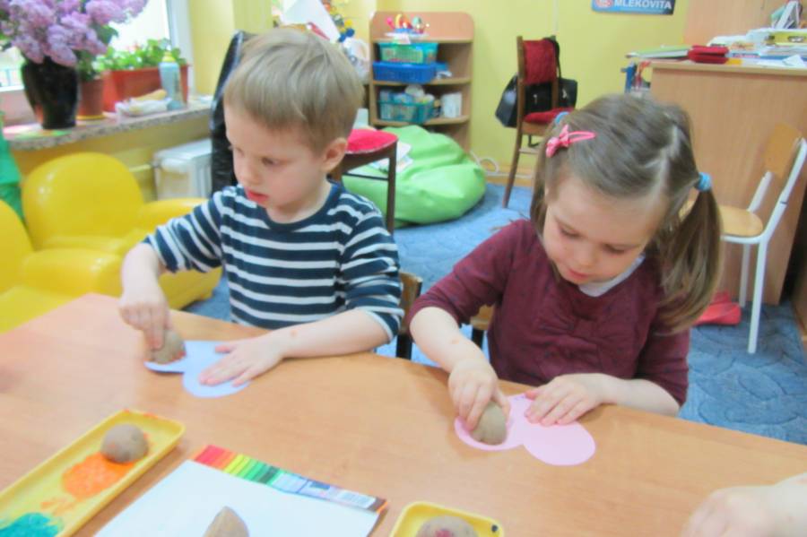 Maluszki starannie wykonywały prace ukochanym Rodzicom - „ Ziemniaczane stempelki na serduszkach dla mamy i taty”.