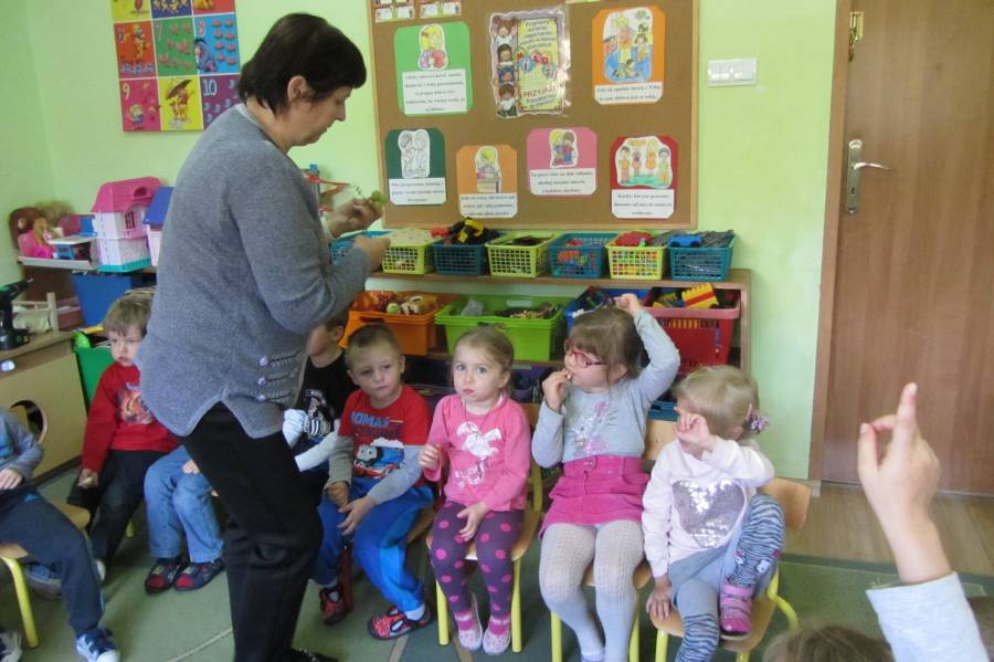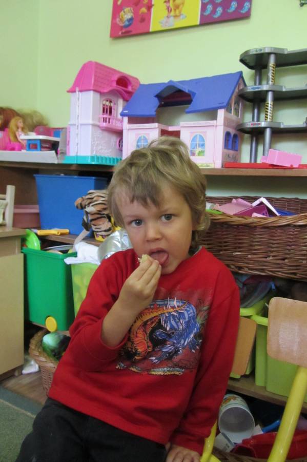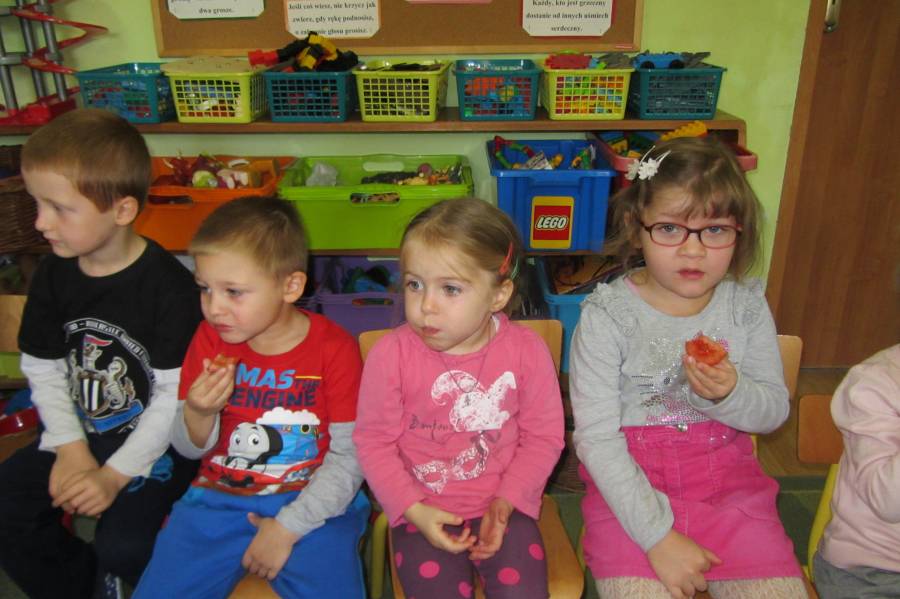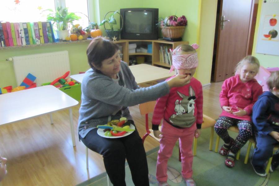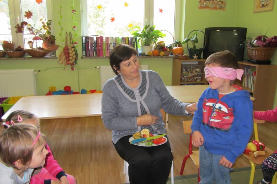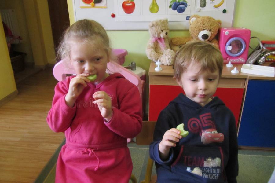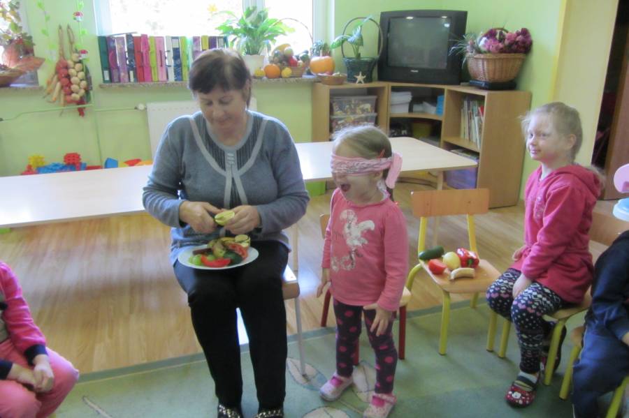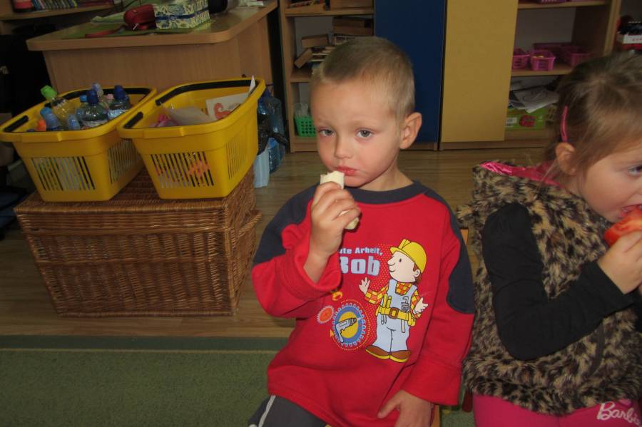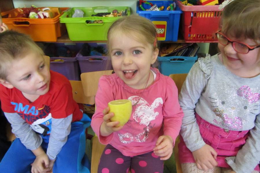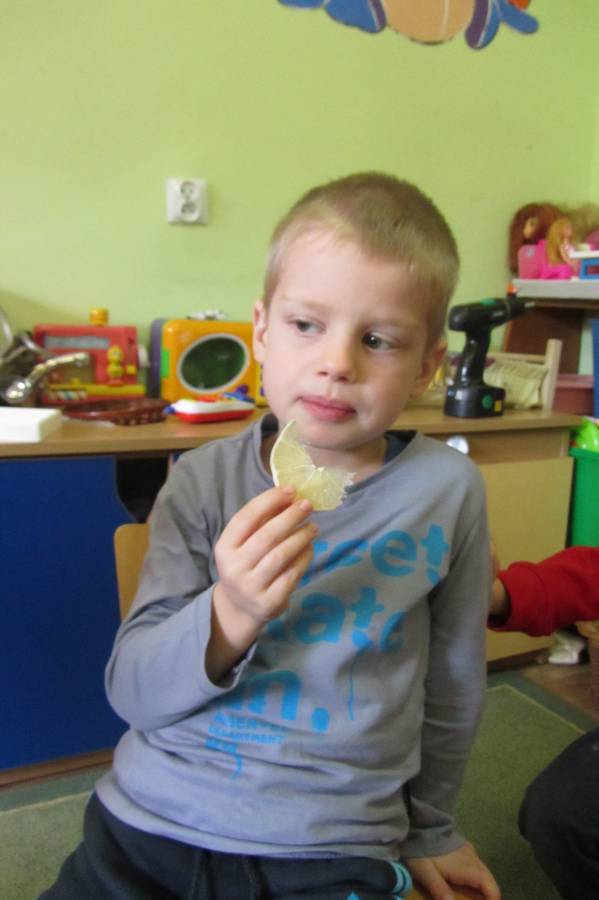 Jesień zawitała również do grupy Elfów - dzieci przynosiły różne owoce i warzywa - dary jesieni, o których rozmawiały, a na koniec ochoczo smakowały zdrowe witaminki. Jadły nawet cytrynę - egzotyczny owoc - a przy tym miały uśmiechniętą minę.