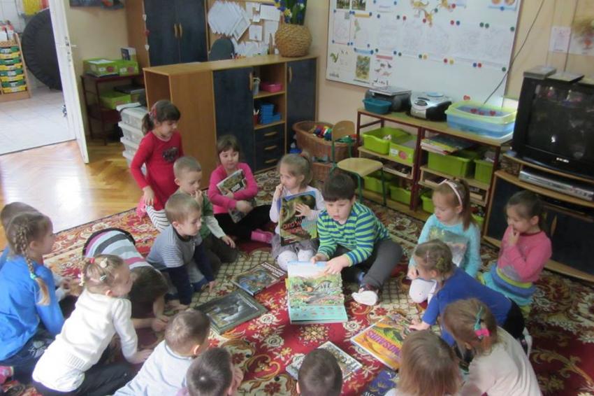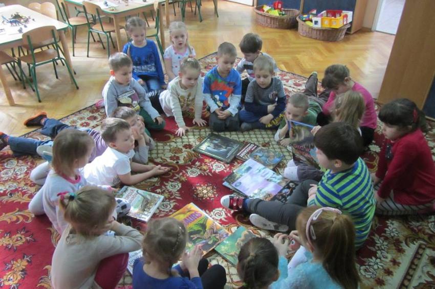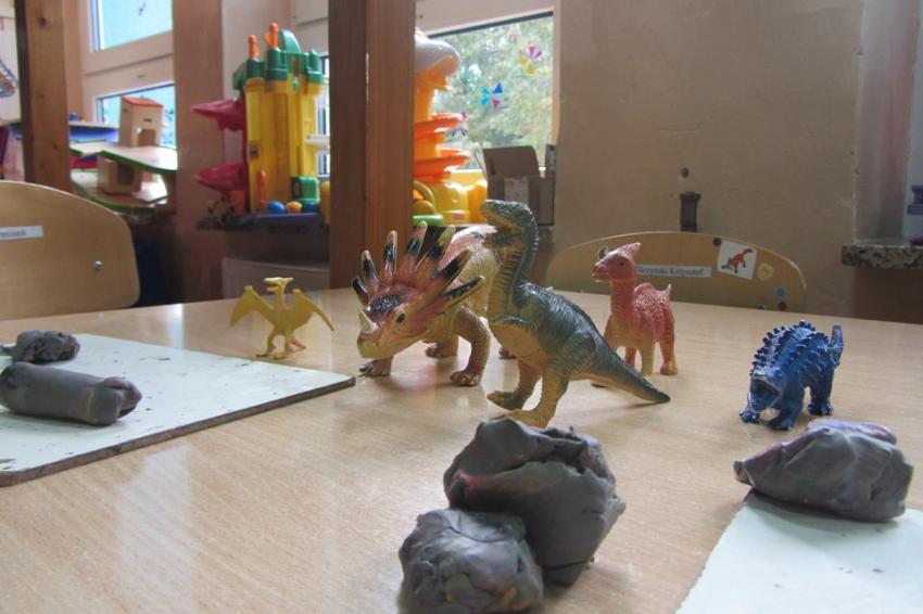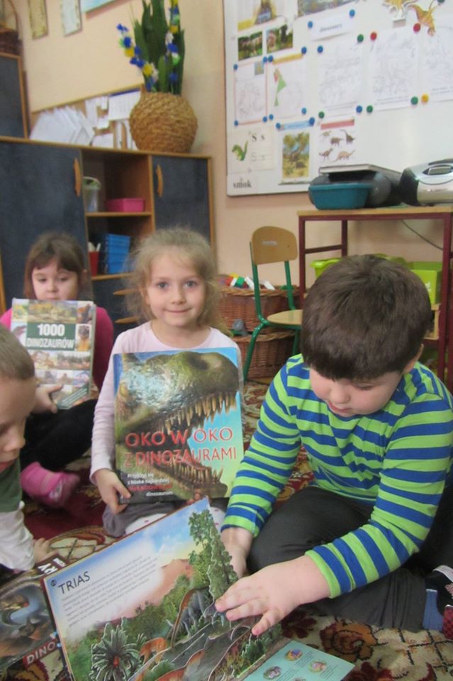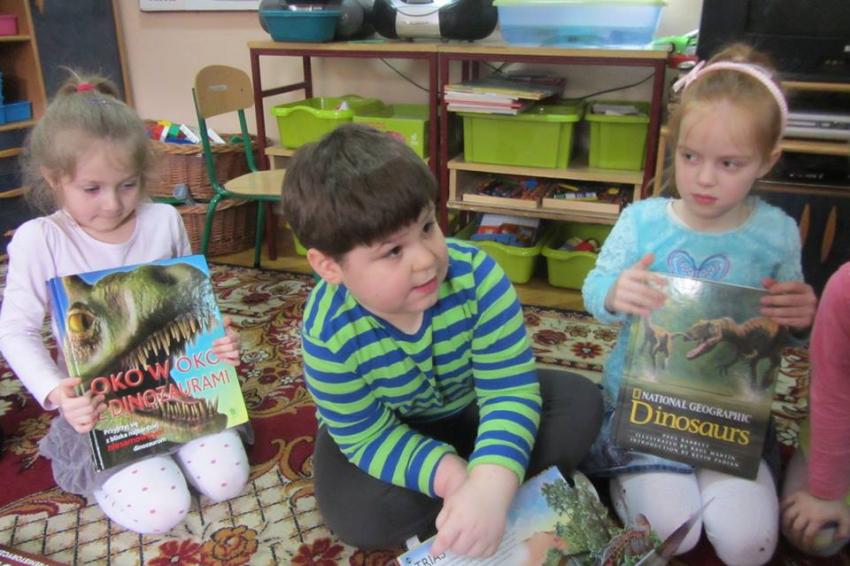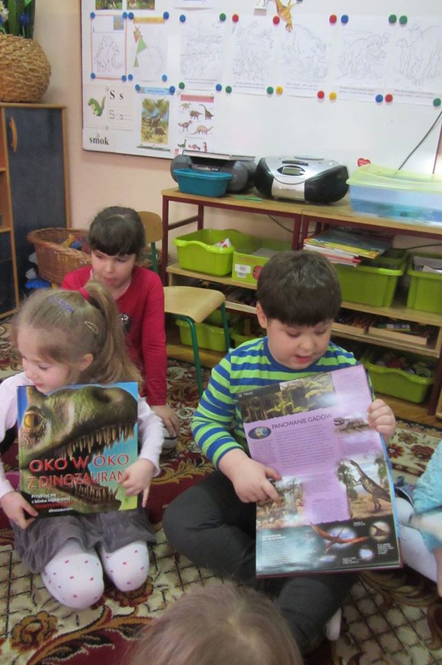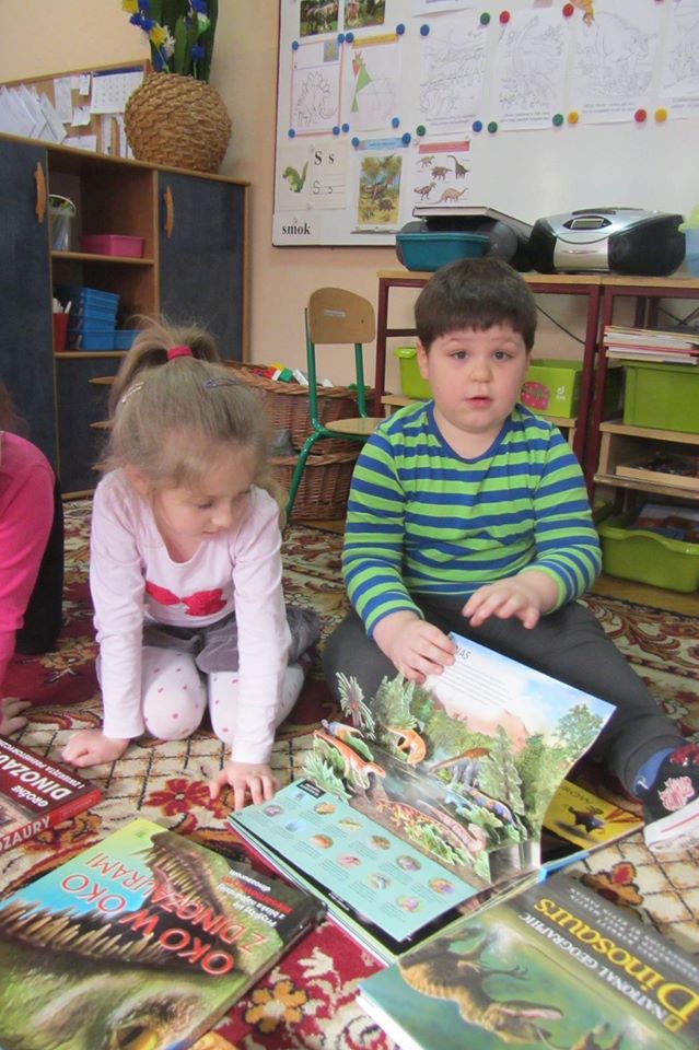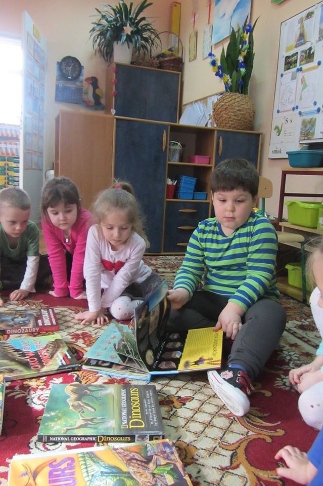 Grupa 5-latków przeniosła się w daleką przeszłość, bowiem w ubiegłym tygodniu dzieci rozmawiały na temat dinozaurów. Dzieci zaprosiły gościa - innego naszego przedszkolaka - Kubę Abramowicza, który fascynuje się światem dawnych gadów. To jego hobby! Kuba z wielkim zaangażowaniem opowiadał o prehistorycznych mieszkańcach Ziemi, a Gumisie słuchały tych przygód z ogromną ciekawością. BRAWO!!!