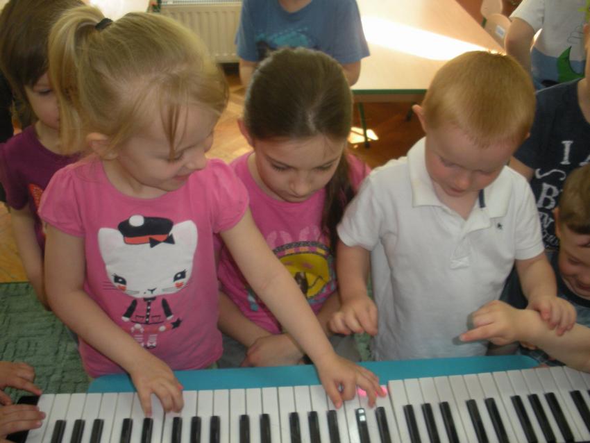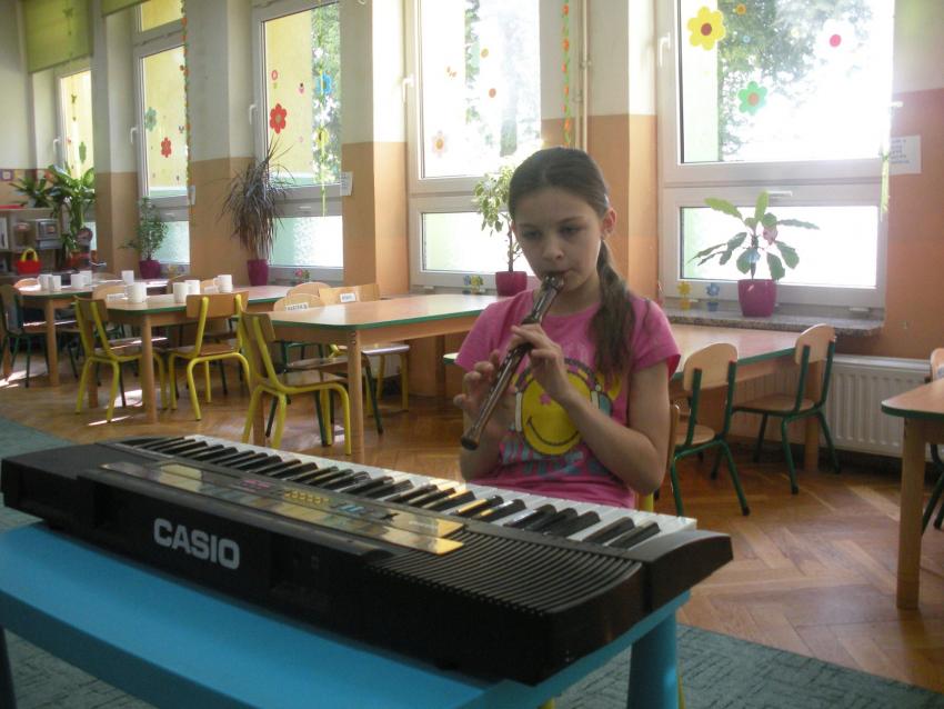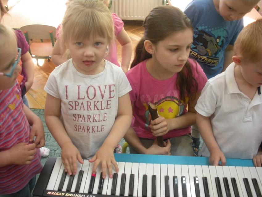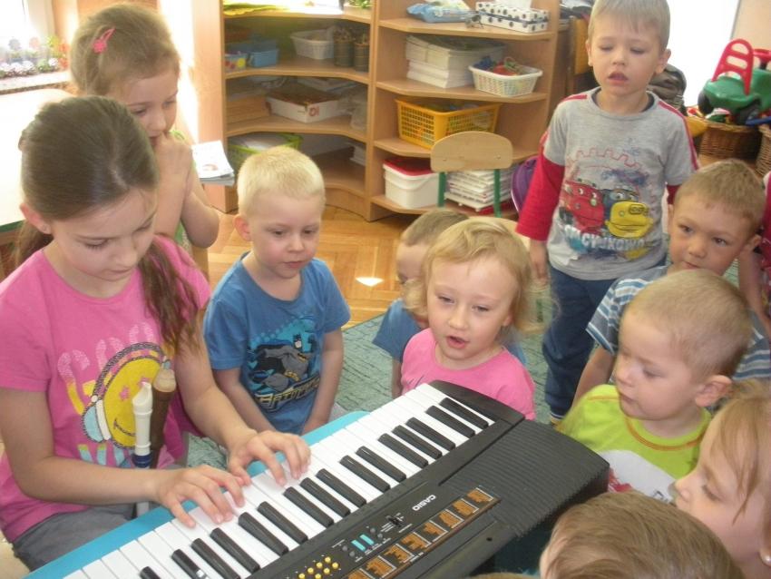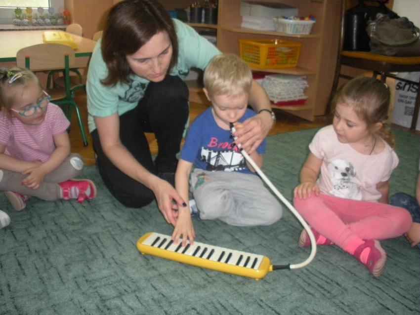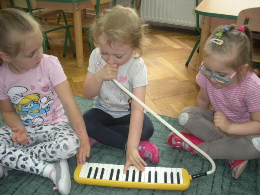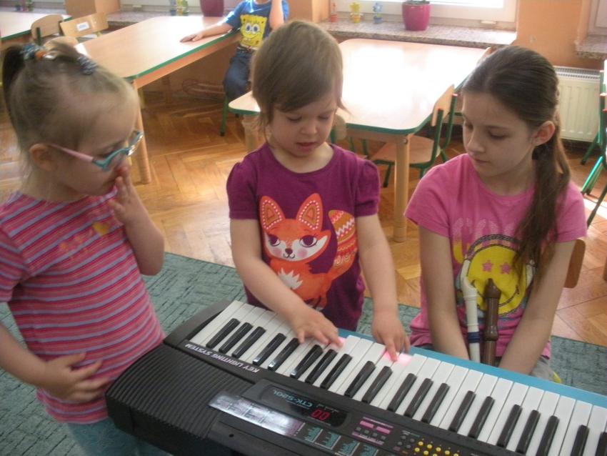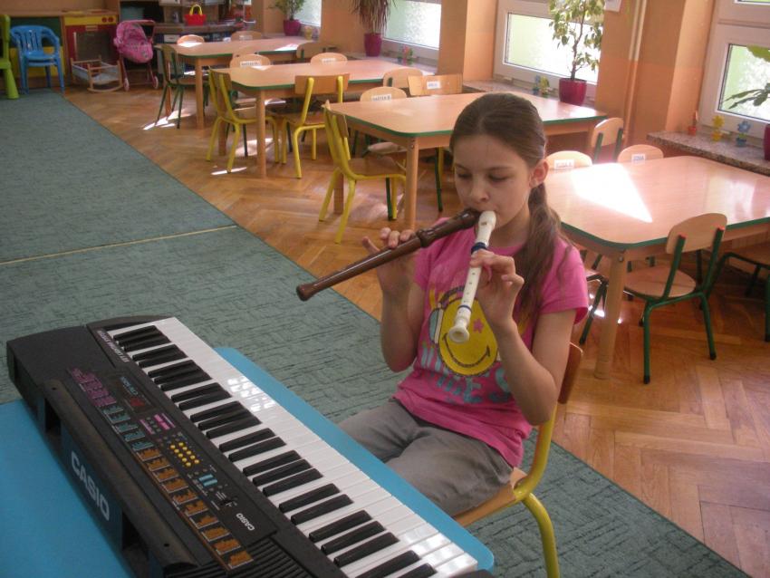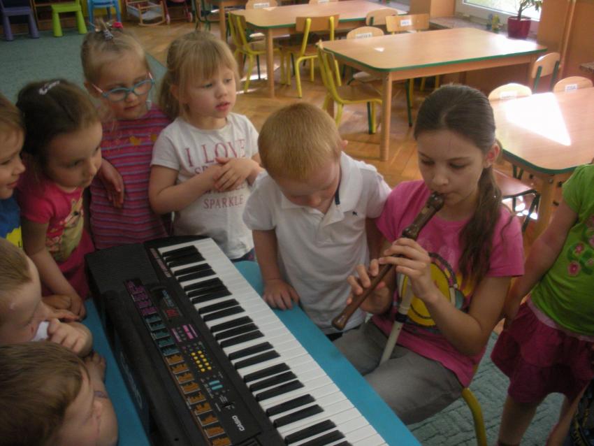 Muminki gościły u siebie Maję - absolwentkę naszego przedszkola, która opowiadała dzieciom o swoim hobby: o muzyce. Maja grała dzieciom na keyboardzie i flecie popularne melodie dziecięce. Ku uciesze dzieci, Maja grała też na dwóch fletach jednocześnie, a nawet - zagrała nosem! Muminki pękały ze śmiechu! Dzieci chętnie próbowały grać, a także z zainteresowaniem przeglądały zapisane przy pomocy nut melodie wygrywane przez Maję. Próbowały stworzyć własną orkiestrę. Jednak największą frajdą było wydobywanie dźwięków z różnego rodzaju instrumentów.