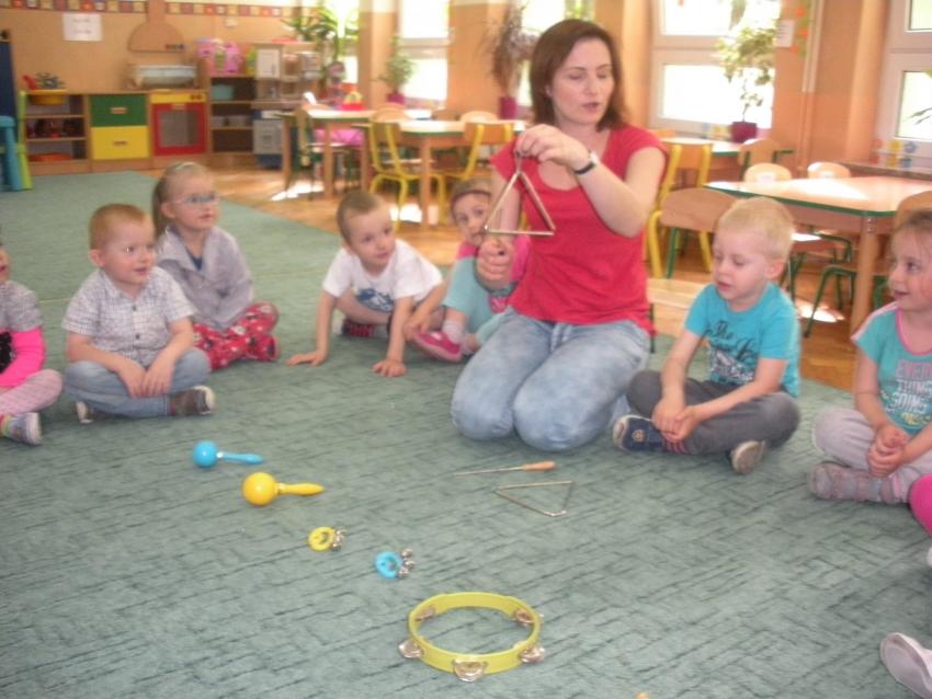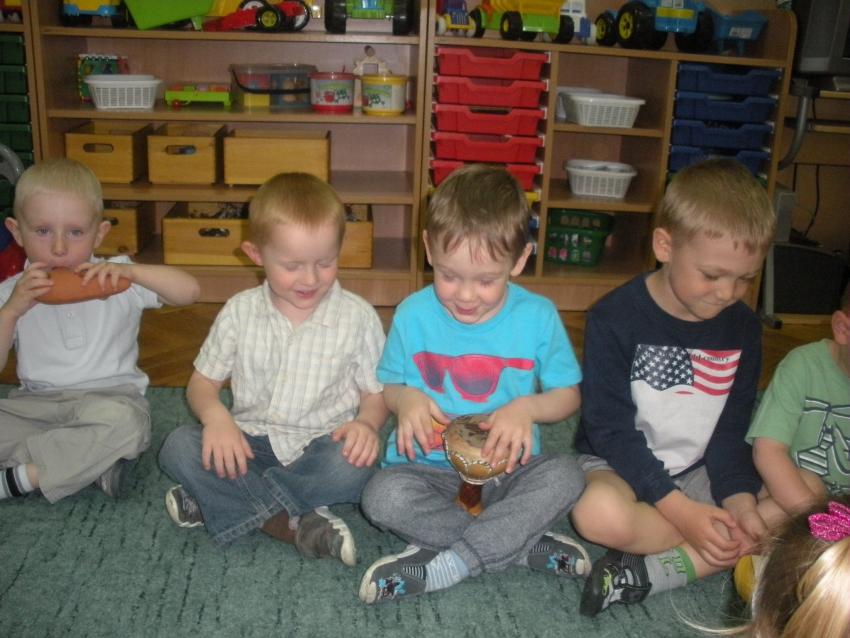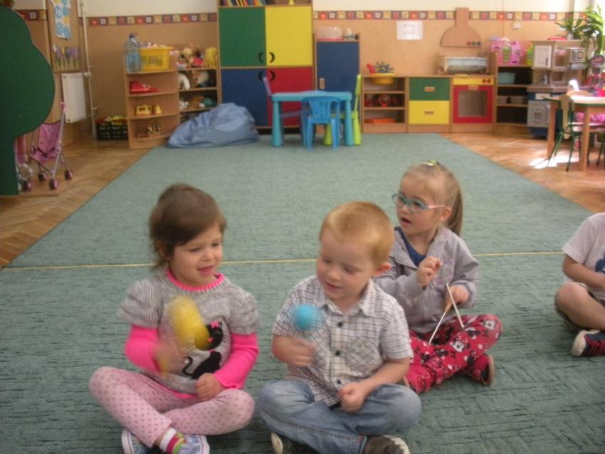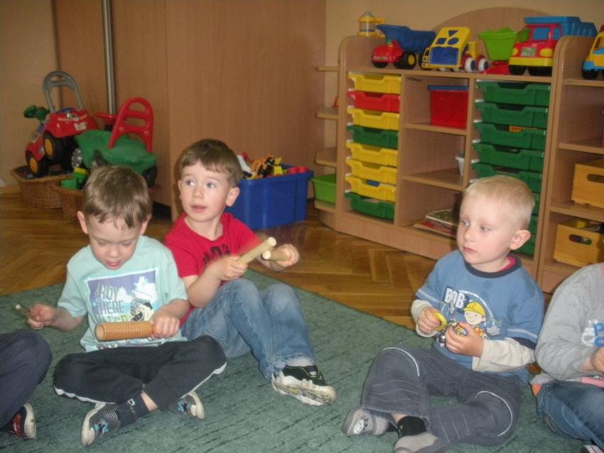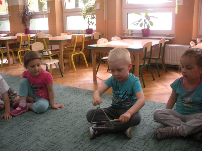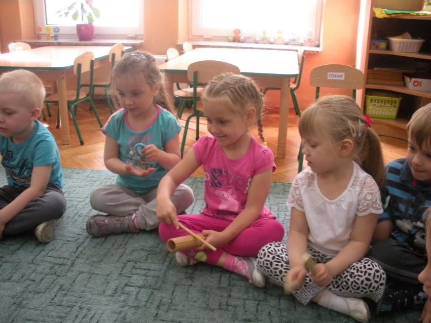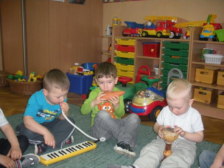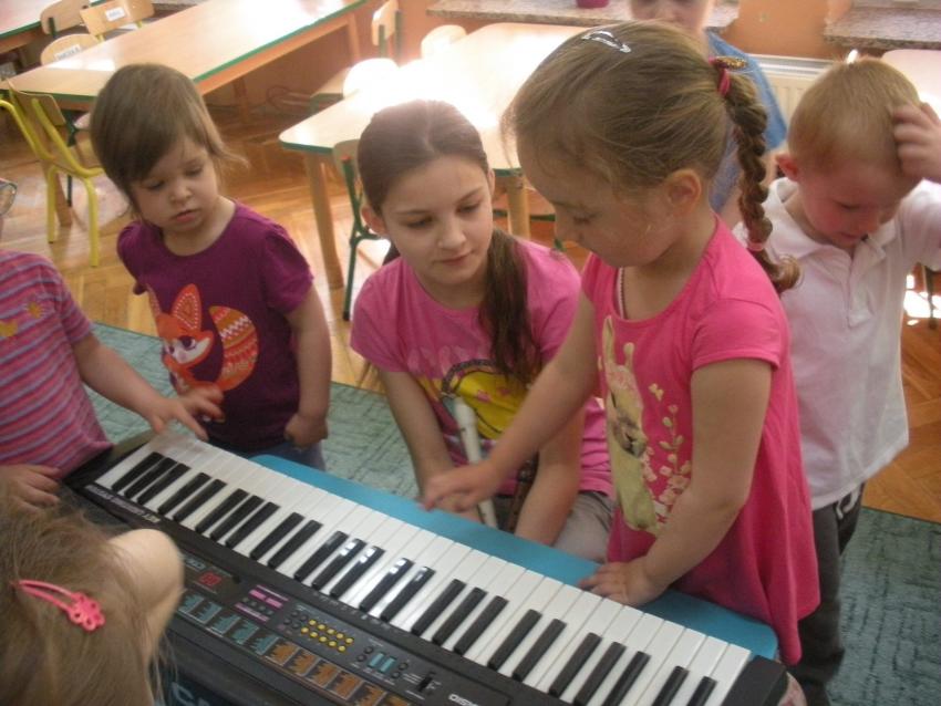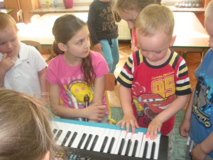 Muminki gościły u siebie Maję - absolwentkę naszego przedszkola, która opowiadała dzieciom o swoim hobby: o muzyce. Maja grała dzieciom na keyboardzie i flecie popularne melodie dziecięce. Ku uciesze dzieci, Maja grała też na dwóch fletach jednocześnie, a nawet - zagrała nosem! Muminki pękały ze śmiechu! Dzieci chętnie próbowały grać, a także z zainteresowaniem przeglądały zapisane przy pomocy nut melodie wygrywane przez Maję. Próbowały stworzyć własną orkiestrę. Jednak największą frajdą było wydobywanie dźwięków z różnego rodzaju instrumentów.