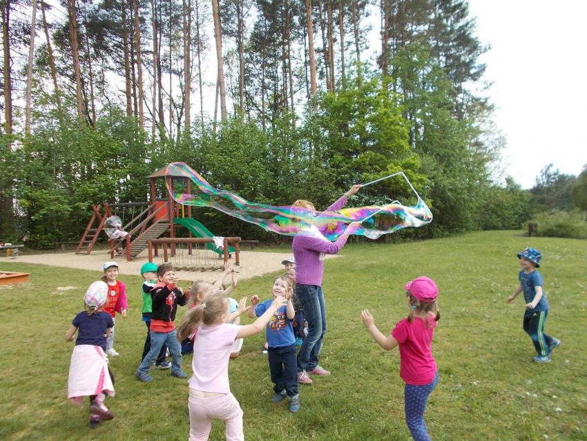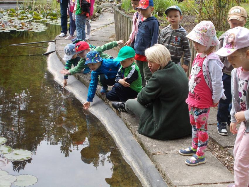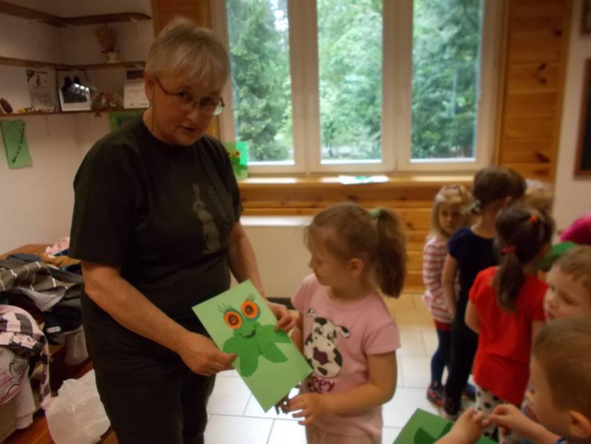 Nie dorówna żabce nikt"............ Żaba – to bohaterka naszych ostatnich zajęć w Arboretum. Leśne Ludki zapoznały się ze środowiskiem, w którym żyją żaby, dowiedziały się co jedzą, w jakich warunkach czują się dobrze i poznały ich etapy rozwoju. Dzieci miały okazję poznać i obejrzeć z bliska żabę oraz kijankę. Dowiedziały się, że są „żaby zielone” i „żaby brunatne”. Poznały nazwy żab chronionych i zapisanych w Czerwonej Księdze Zwierząt - ropucha szara, żaba wodna, grzebiuszka ziemna. Dzieci wsłuchiwały się w koncert żabi – potem naśladowały odgłosy żab! Wszyscy mieliśmy możliwość kumkania czy rechotania - co wywołało ogromną radość u wszystkich uczestników. Zajęcia zakończyły się wyścigiem małych żabek. To były naprawdę wspaniałe zajęcia edukacyjne.