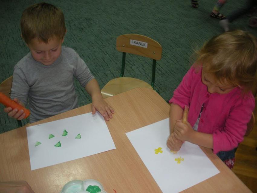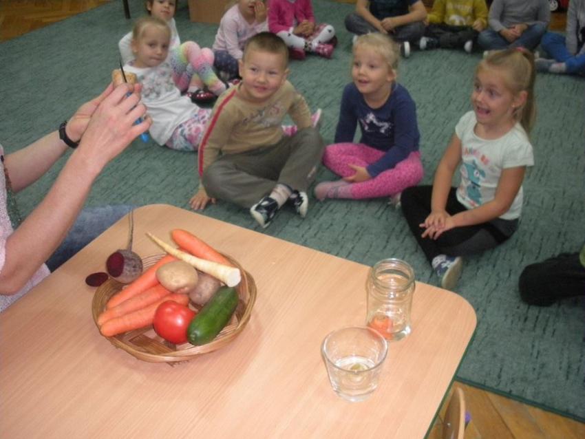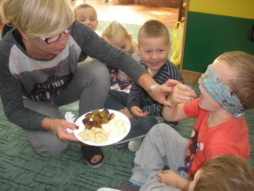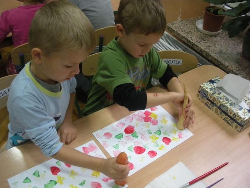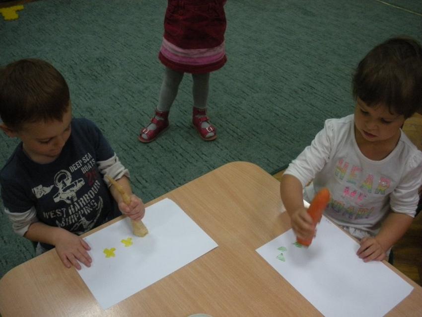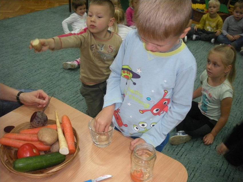 "Kto je owoce i warzywa, ten zazwyczaj zdrowy bywa"! Wiedzą o tym Muminki, rozpoznają też owoce po smaku a warzywa po zapachu. Chętnie wykonywały stemple warzywne i uczestniczyły w zabawach badawczych.