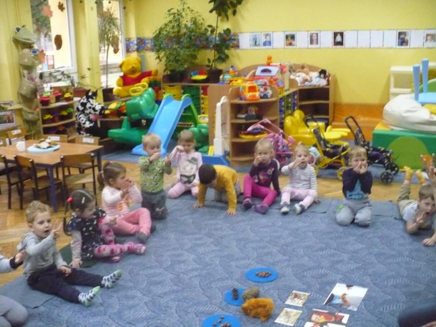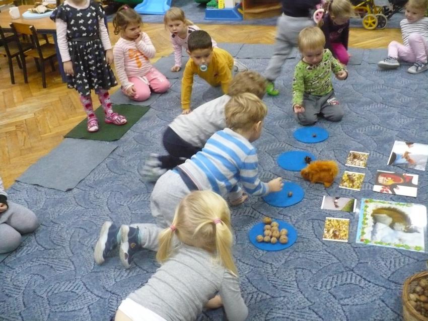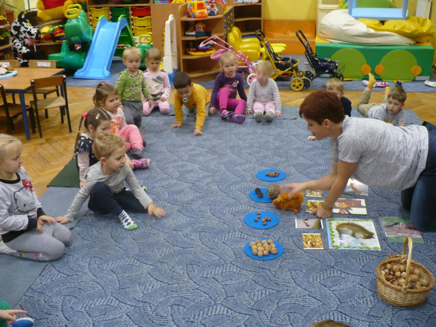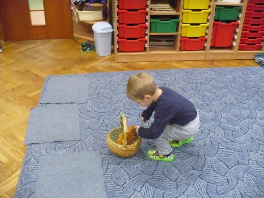 Krasnoludki pomagają roztargnionej wiewiórce odnaleźć i uporządkować zapasy na zimę.