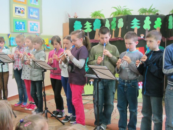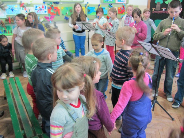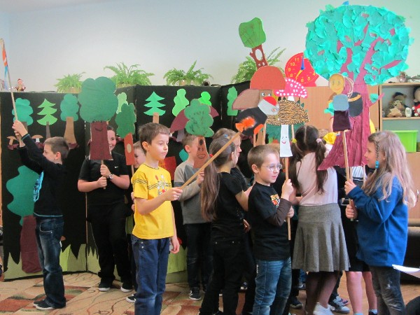 Dnia 11 kwietnia na zaproszenie pani Joanny, nauczycielki ze szkoły podstawowej w Supraślu, przedszkolaki z grupy ''Muminków" obejrzały przedstawienie pt."Co słychać w lesie" przygotowane przez uczniów z klasy II. W przedstawianiu wykorzystano fragmenty wierszy polskich poetów. Na zakończenie wysłuchaliśmy ''mini'' koncertu w wykonaniu uczniów z klasy III . Wspólnie spędzony czas, możliwość pokazania swoich umiejętności aktorskich na zewnątrz okazały się bardzo przyjemną formą spędzenia czasu zarówno dla przedszkolaków jak i uczniów. Czekamy z niecierpliwością na kolejne tak wspaniałe występy!