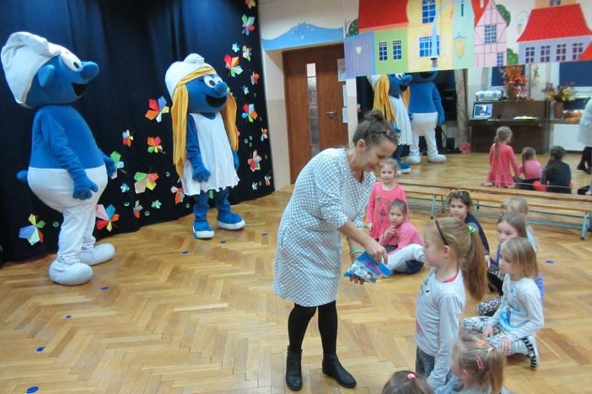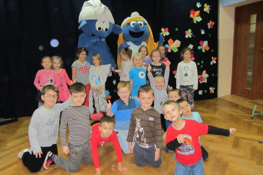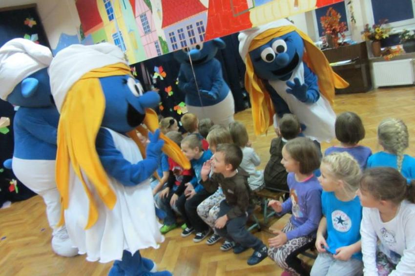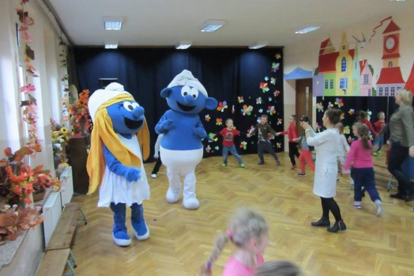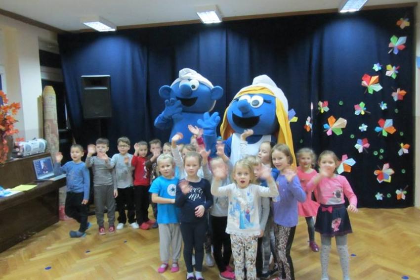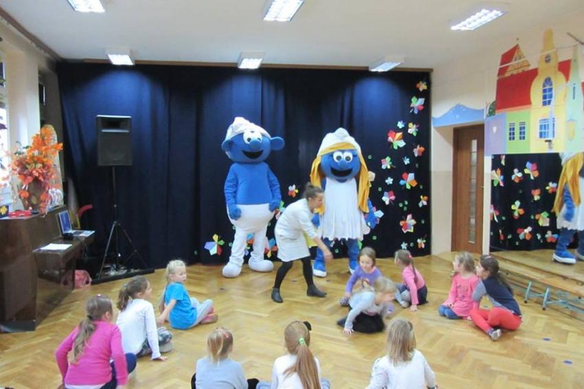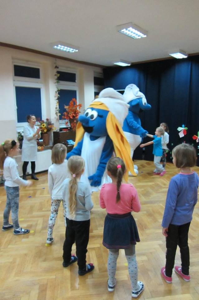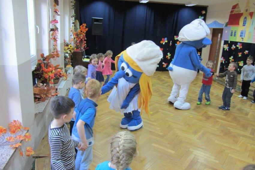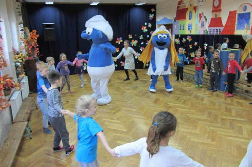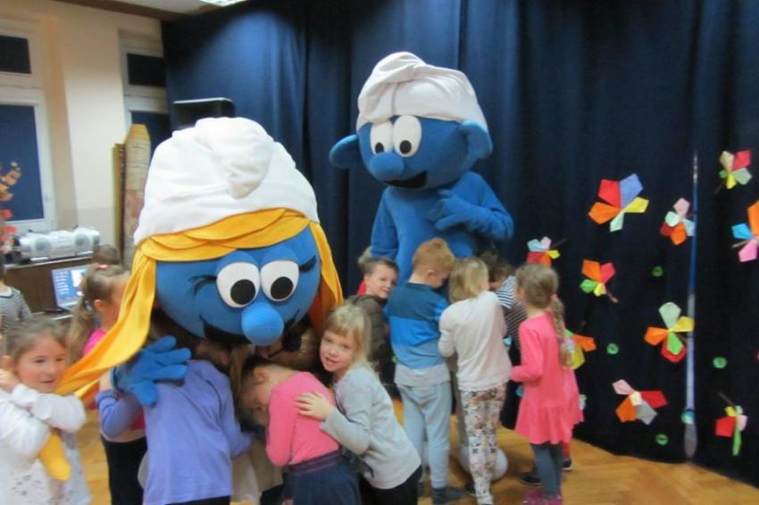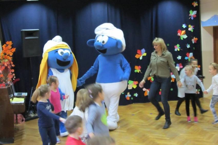 Impreza animacyjna „Smerfy” zorganizowana przez mamę Noeli.Smerfy zatańczyły z całą grupą dwa tańce: „A ram zam zam” i „ Chocolate Choco choco”. Odgadywały zagadki zadawane przez Smerfetkę i Smerfa Ciamajdę.Otrzymały nagrody w postaci malowanek i pianek smerfowych.