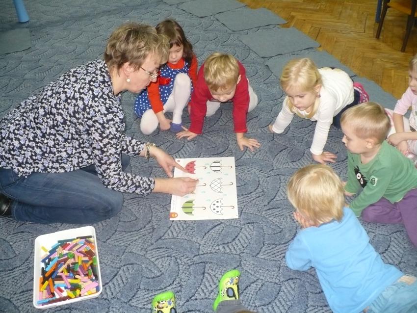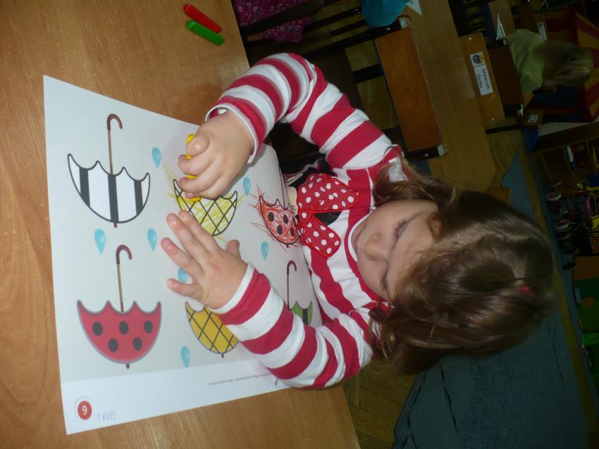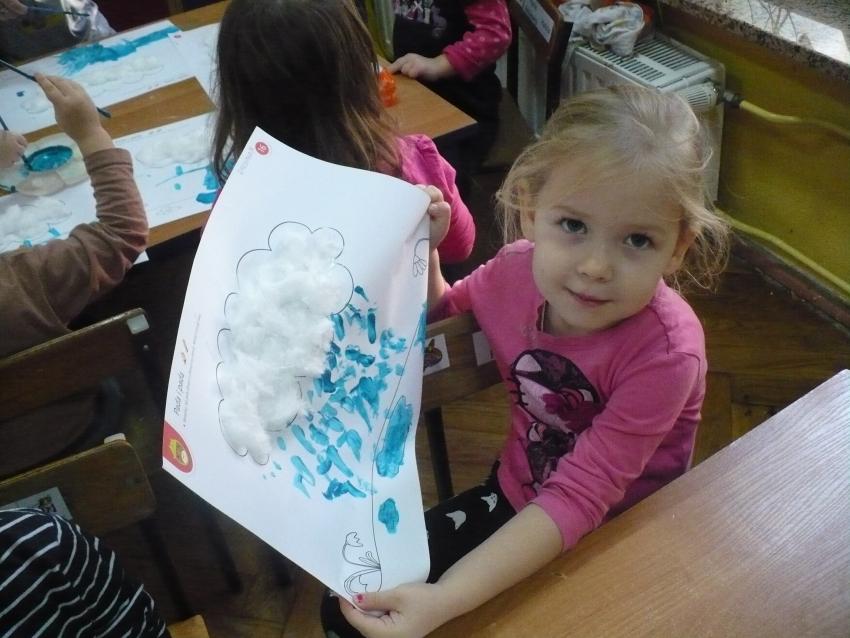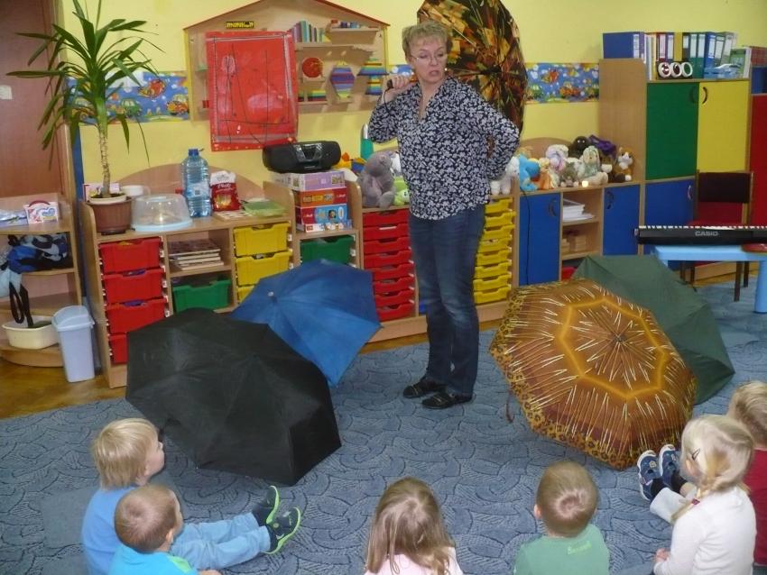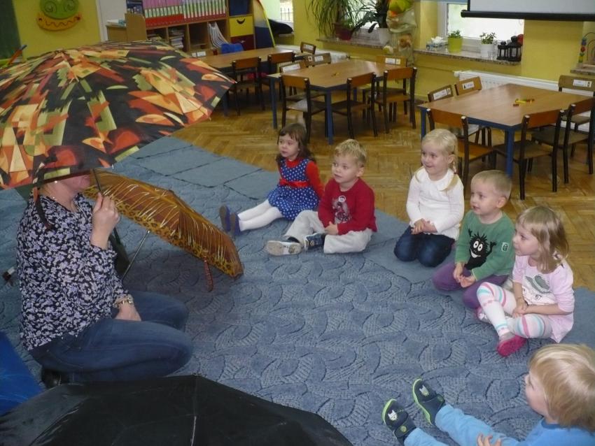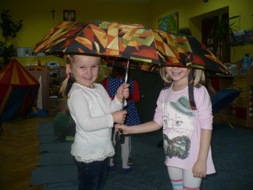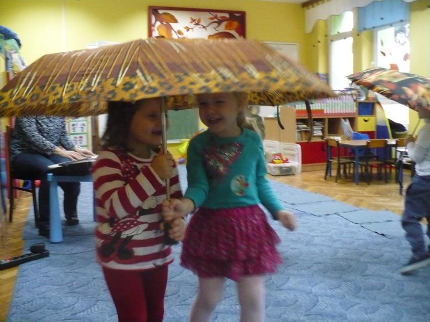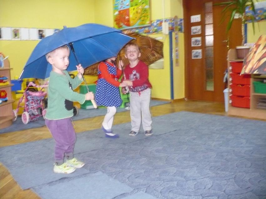 Krasnoludki dowiedziały się, jak powstaje deszcz. Uczyły się, jak prawidłowo posługiwać się parasolem i na sucho bawiły się deszczem, chodziły po kałużach, naśladowały rytm spadających kropelek.